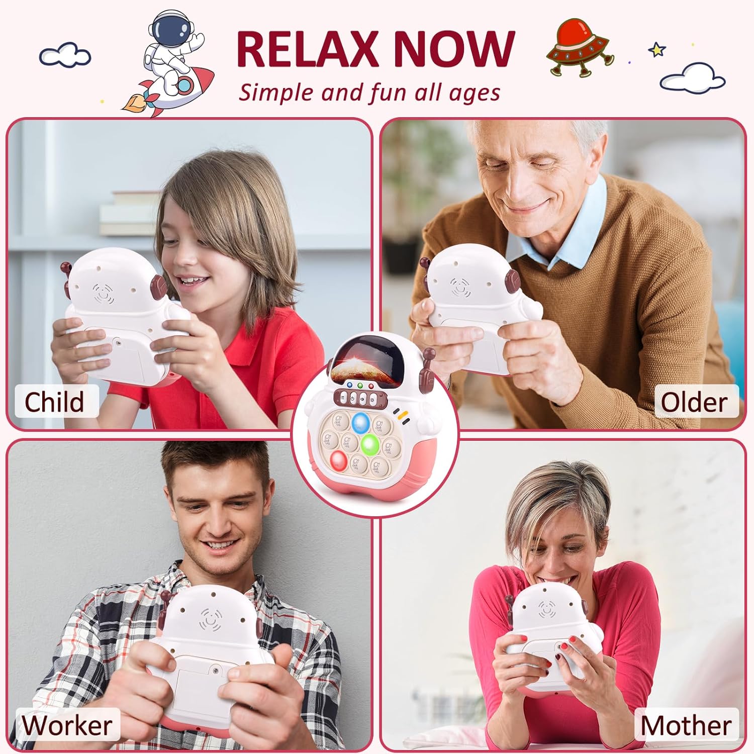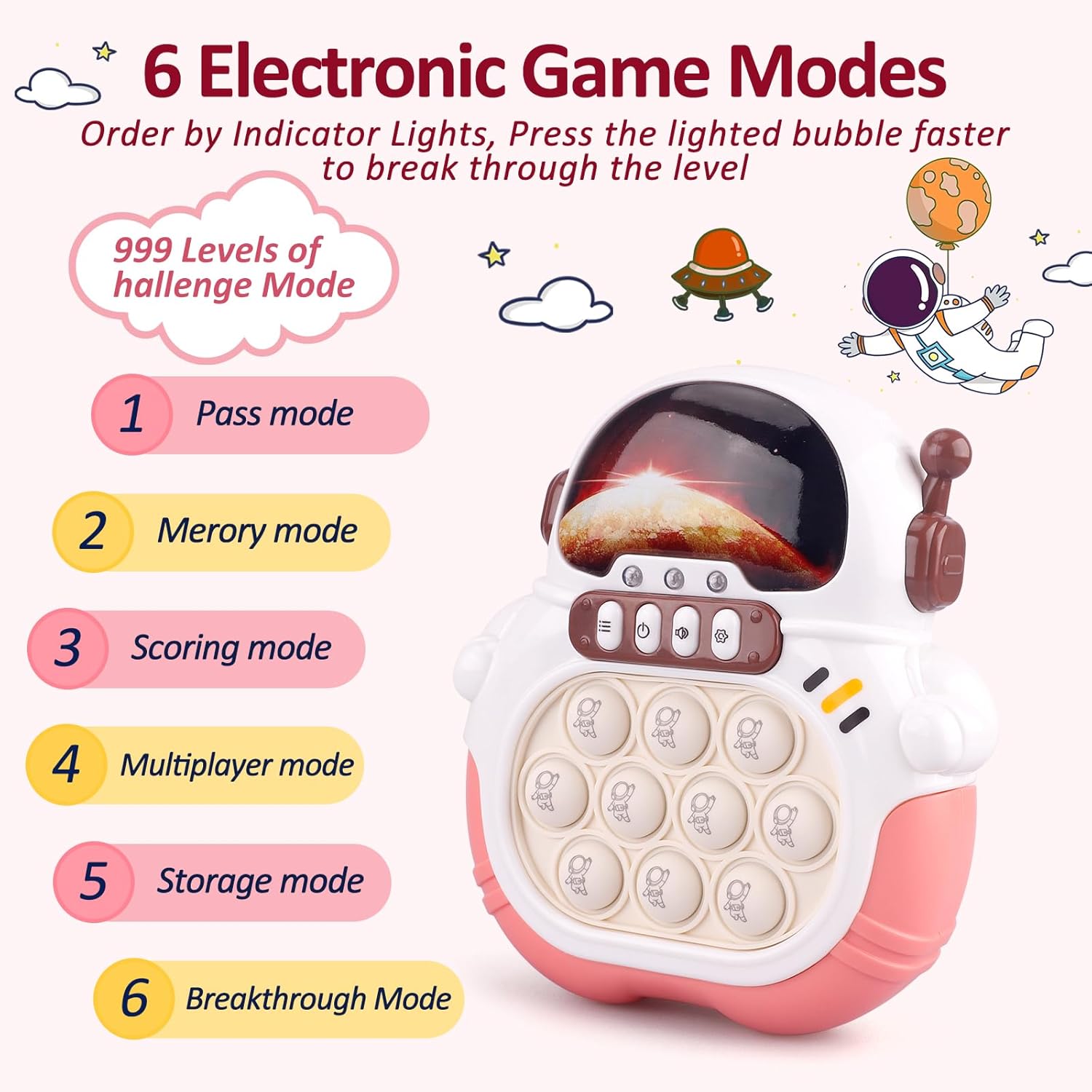 - This astronaut-themed handheld puzzle game combines the simple joy of fidget toys with the engaging nature of an electronic game, providing a modern twist on the classic fidget toy. making it a unique and attractive toy for kids aged 3 to 12 years.