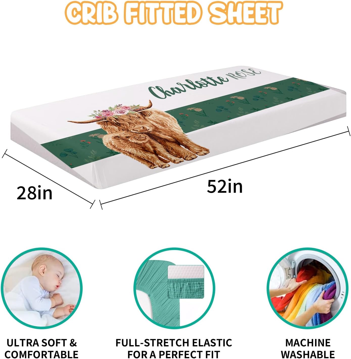 Custom Crib Bedding Set - Highland Cow Design Personalized Name Baby Nursery Bed 3 Pcs Set - Chic Soft Blanket with Dotted Backing, Sheet, Pillowcase for Newborn Girls Boys Gifts Color04