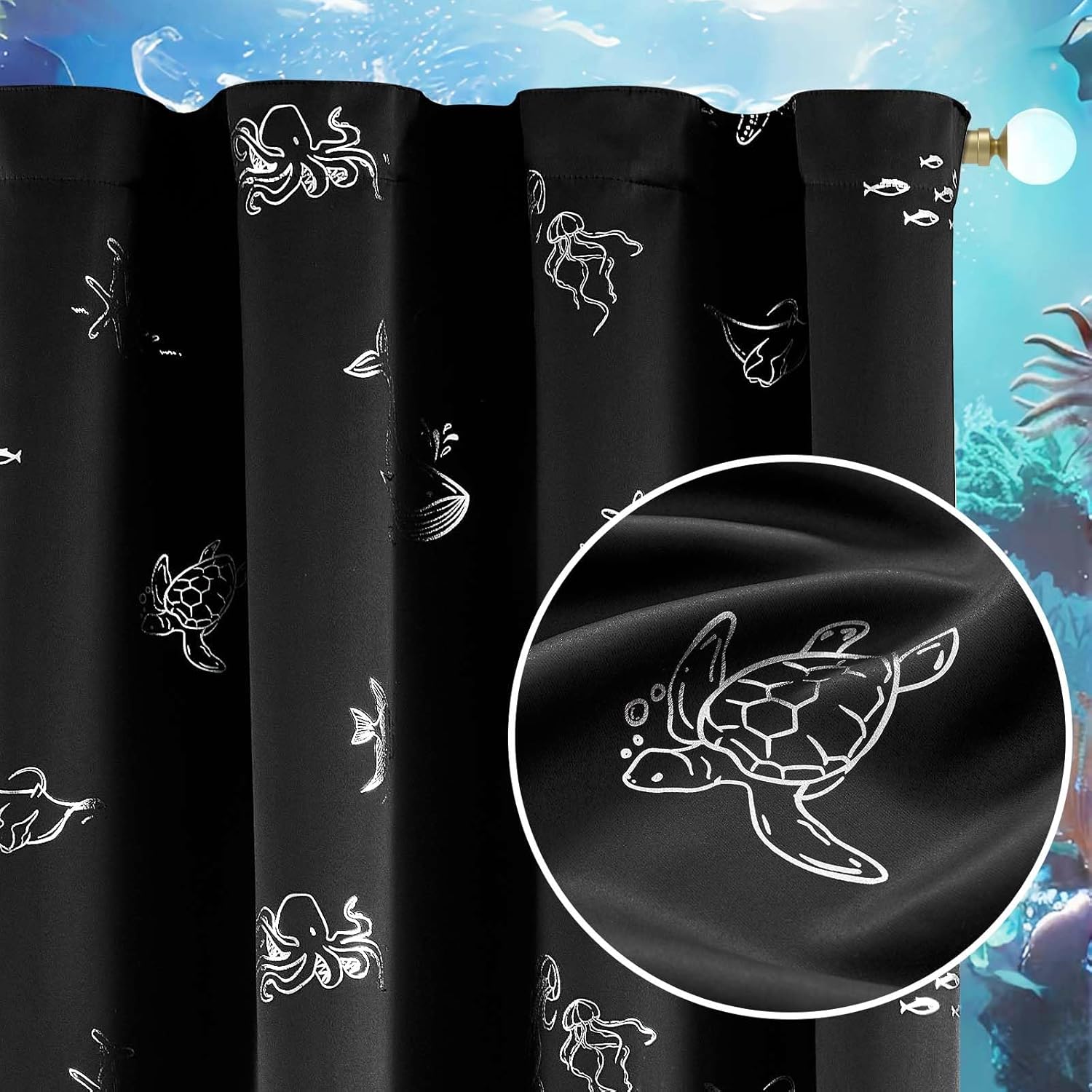 Vangao Kids Curtains for Boys Bedroom Kids Blackout Curtains 63 Inch Length Ocean Aquarium Nursery Drapes for Girls Bedroom Silver Sea Animals Print Thermal Insulated Drapes, Black 2 Panels