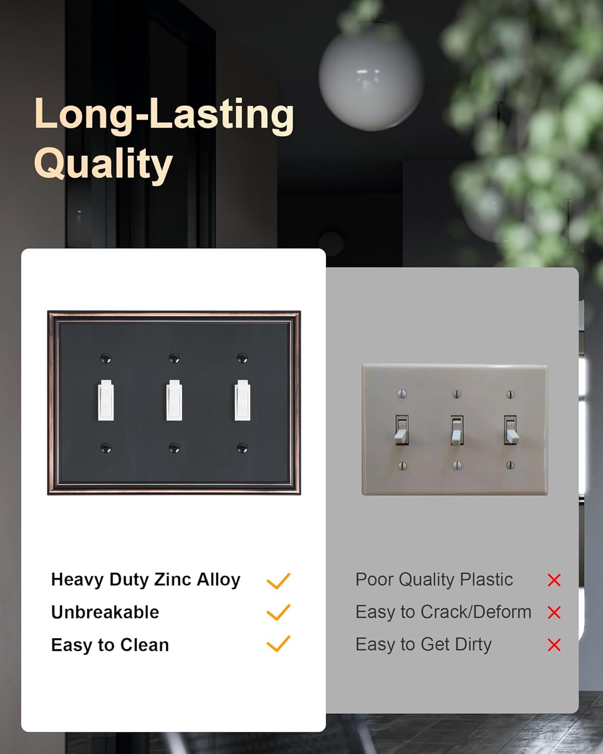 - Durable Solid Zinc Alloy - Constructed from thick and sturdy zinc alloy, the wall switch cover offers exceptional durability and sturdiness, easier to clean and maintain. It is resistant to high impact, tarnishing, and corrosion, unbreakable. Ensuring it remains a stunning addition to your home for years to come.