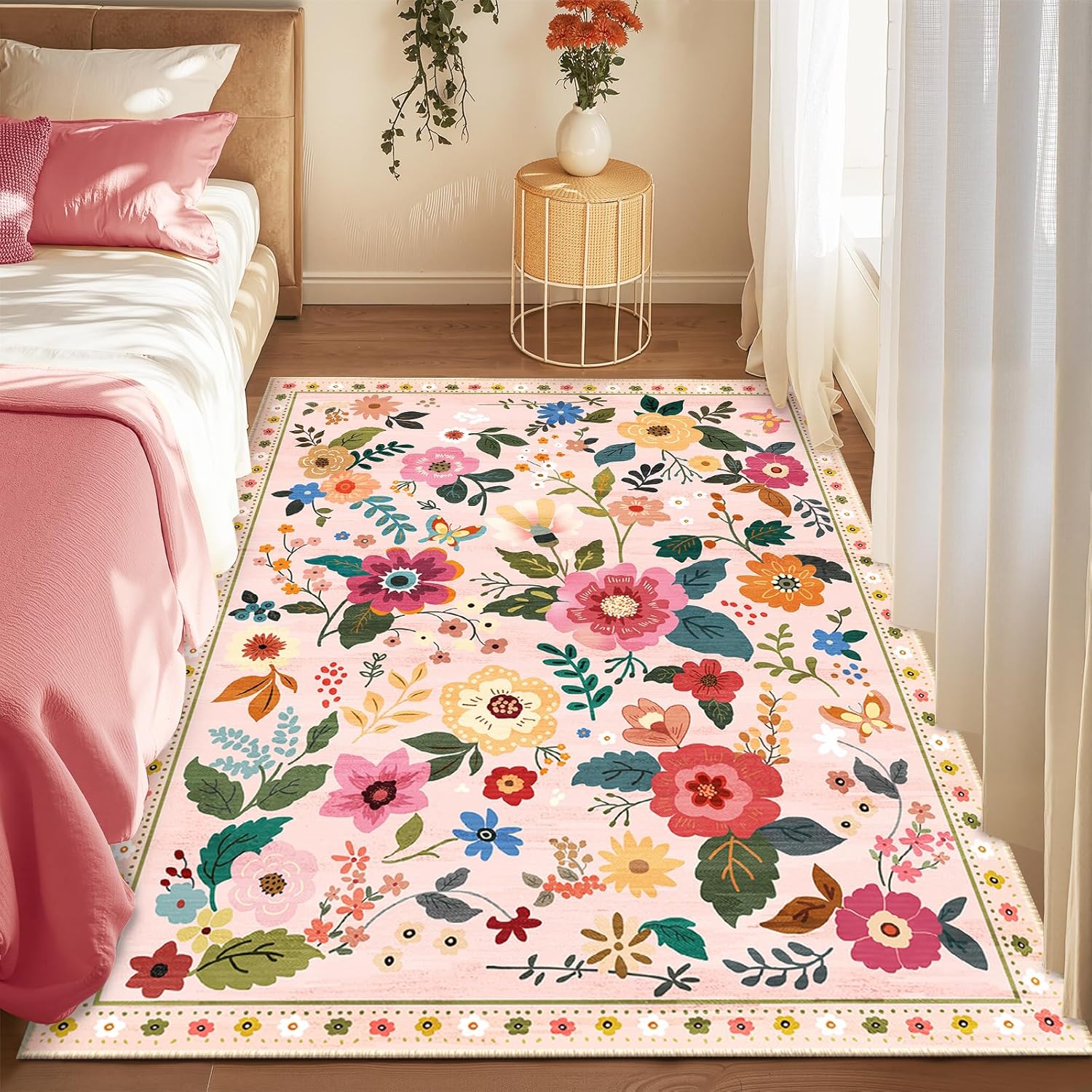 Floral 5x7 Area Rug Machine Washable Soft Print Boho Carpet Non Slip Doormat Low Pile Flower Area Rugs for Living Room Bedroom Nursery Kitchen Dining Room Indoor-Pink