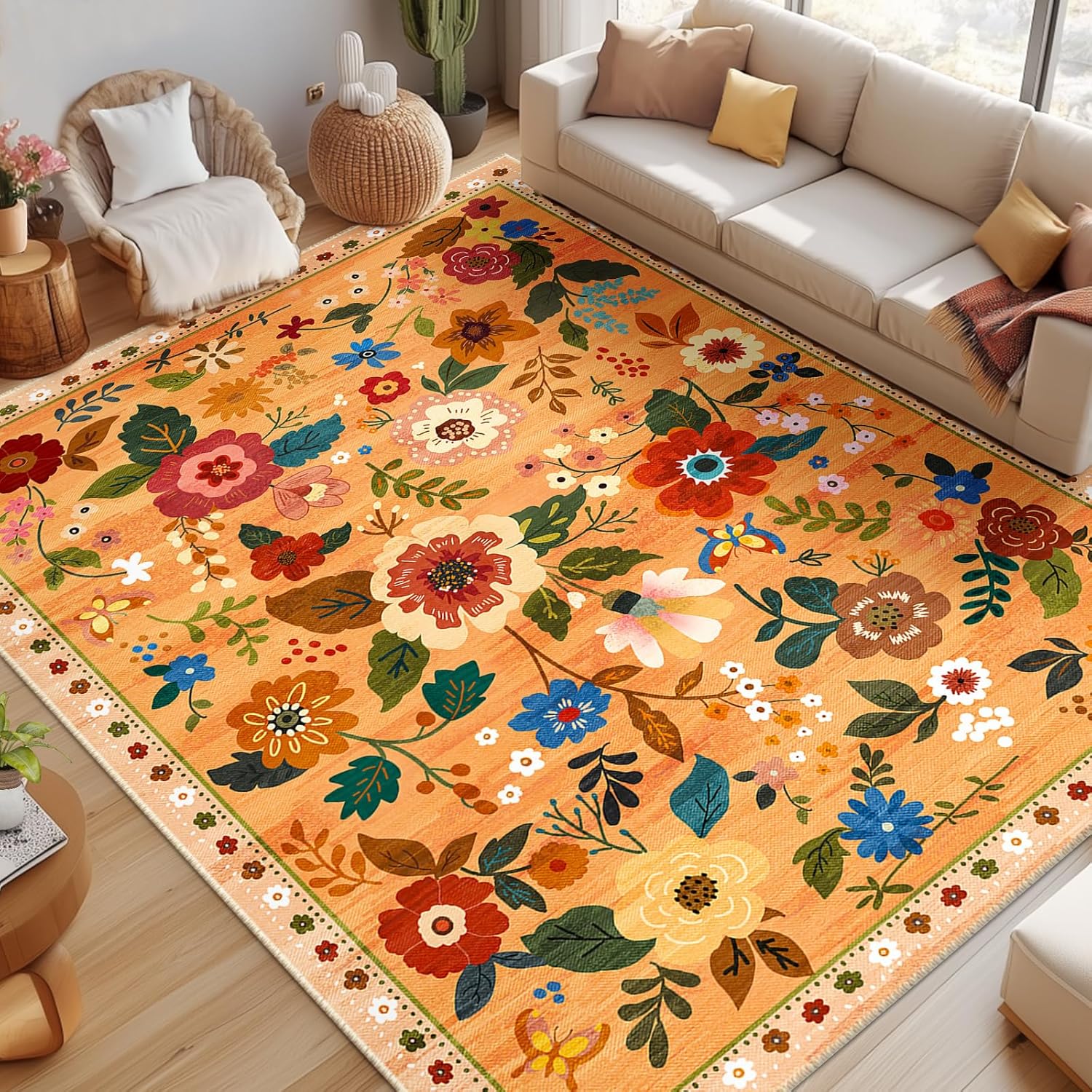 Floral 9x12 Area Rug Machine Washable Soft Print Boho Carpet Non Slip Doormat Low Pile Flower Area Rugs for Living Room Bedroom Nursery Kitchen Dining Room Indoor-Yellow/Orange
