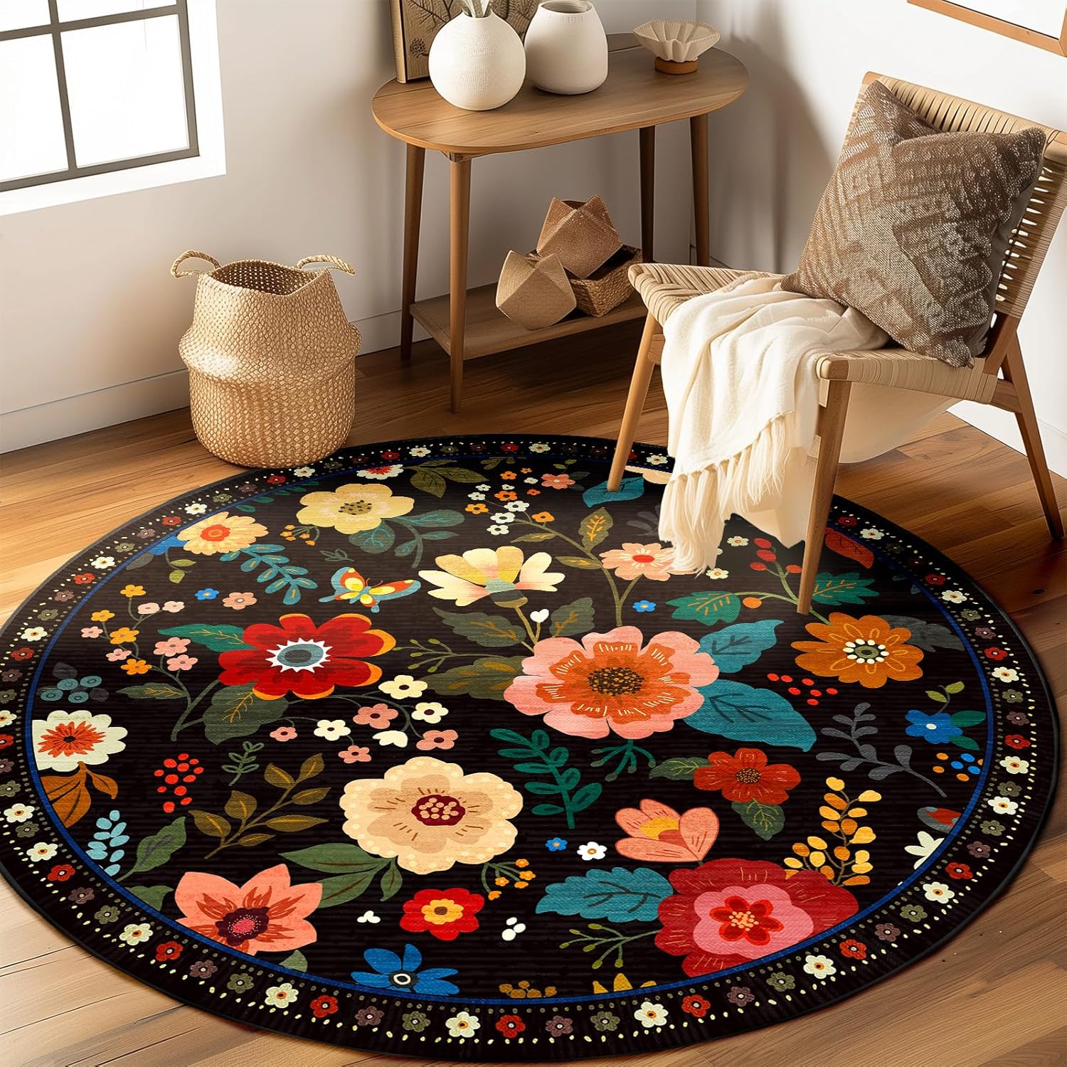 - Machine Washable:The round rug are machine washable,allowing for both machine wash and hand wash options.It is recommended to wash them in cold water.This floral rug is crafted with a low pile that won’t block opening and closing doors, make machine wash possible.Small stains can be blotted with a rag,soft-bristled brush,vacuum,or robotic vacuum cleaner.Avoid using bleach and high-temperature ironing
