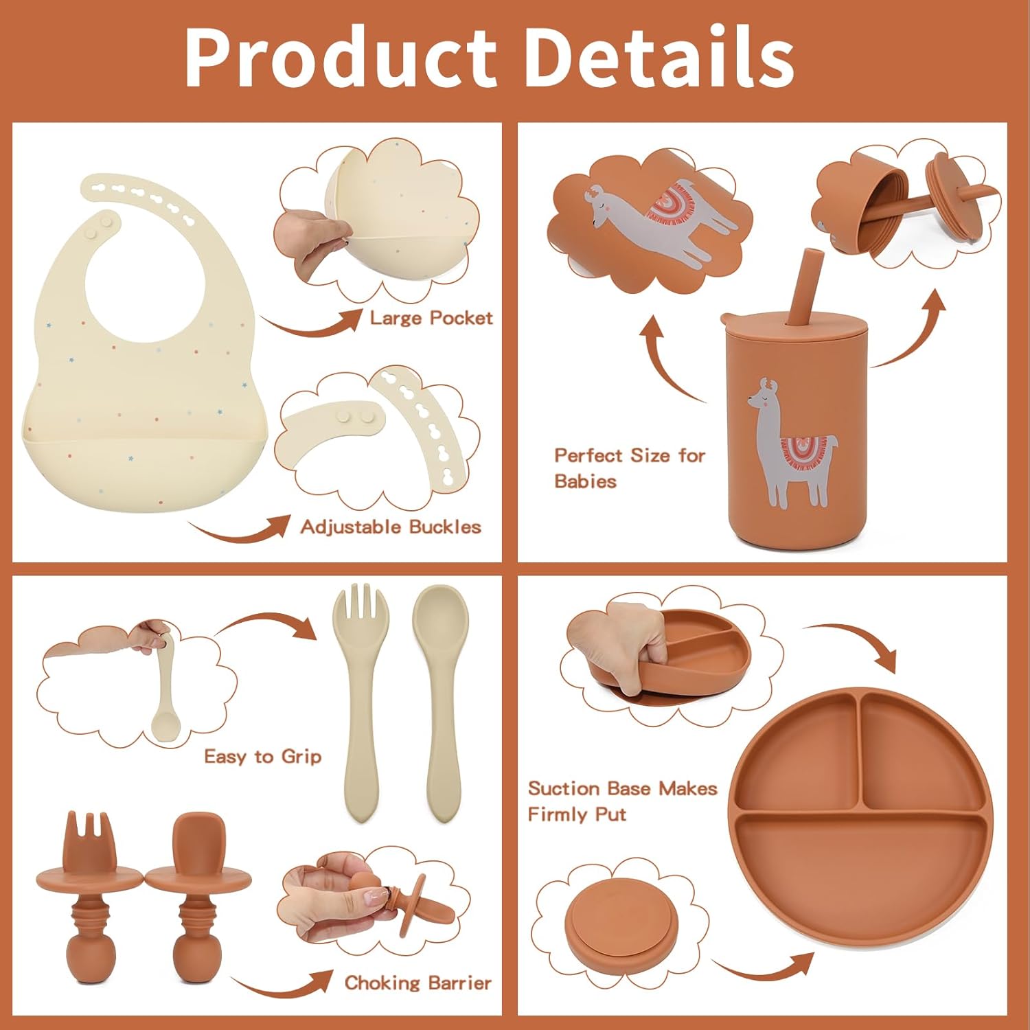 - Baby Feeding Set: Get your baby to love mealtime and free up mom's hands! This 8-piece baby feeding set includes 1 suction-divided plate, 1 straw cup, 2 baby bib with a catch pocket, 1 first-stage toddler fork, 1 first-stage toddler spoon,2 long-handled forks and spoons