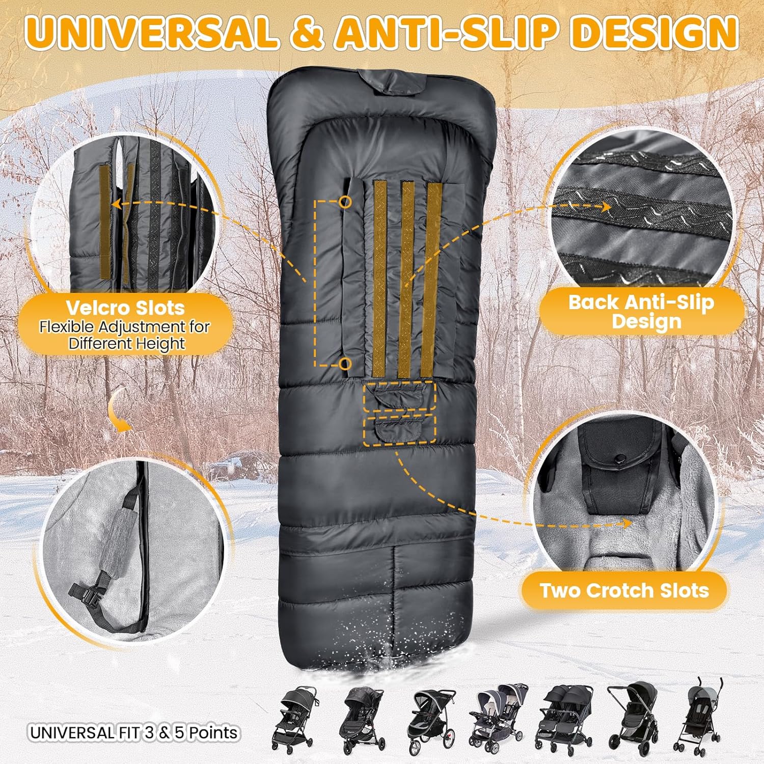 - Adjustable Fit & Anti-Slip: Secures to most strollers via Hook & Loop slots + non-slip textured backing. Reflective strips enhance visibility. 11.81" extended footmuff accommodates toddlers up to 3T/4T/5T (approx. 3-5 yrs)
