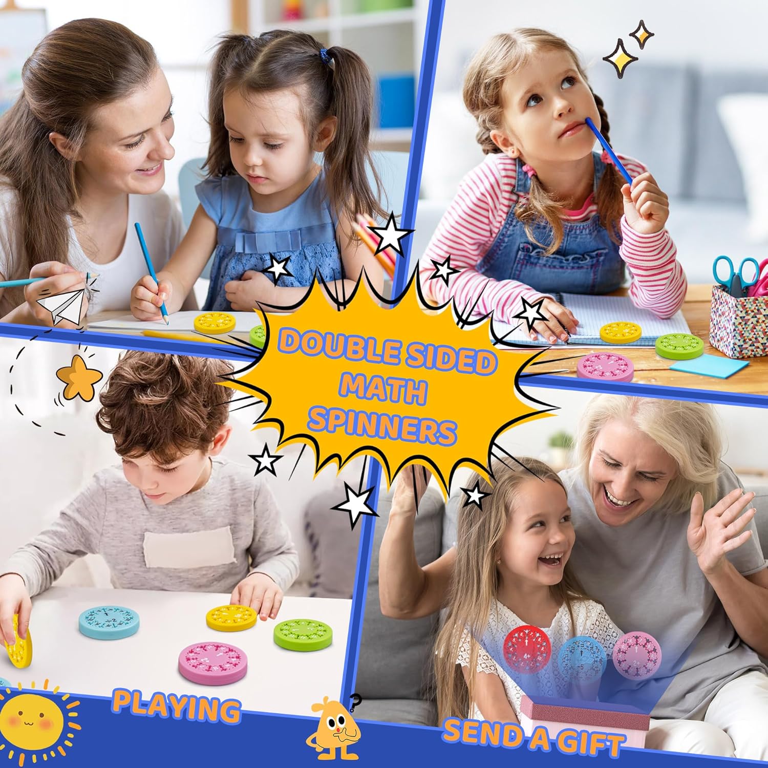 - Fun and interactive:Children can complete different math challenges such as addition and subtraction,number matching and shape recognition by spinning math spinners,making the learning process fun and challenging.The design of the fidget spinner can help children reduce anxiety and improve concentration while learning math,allowing them to focus more on the current task.