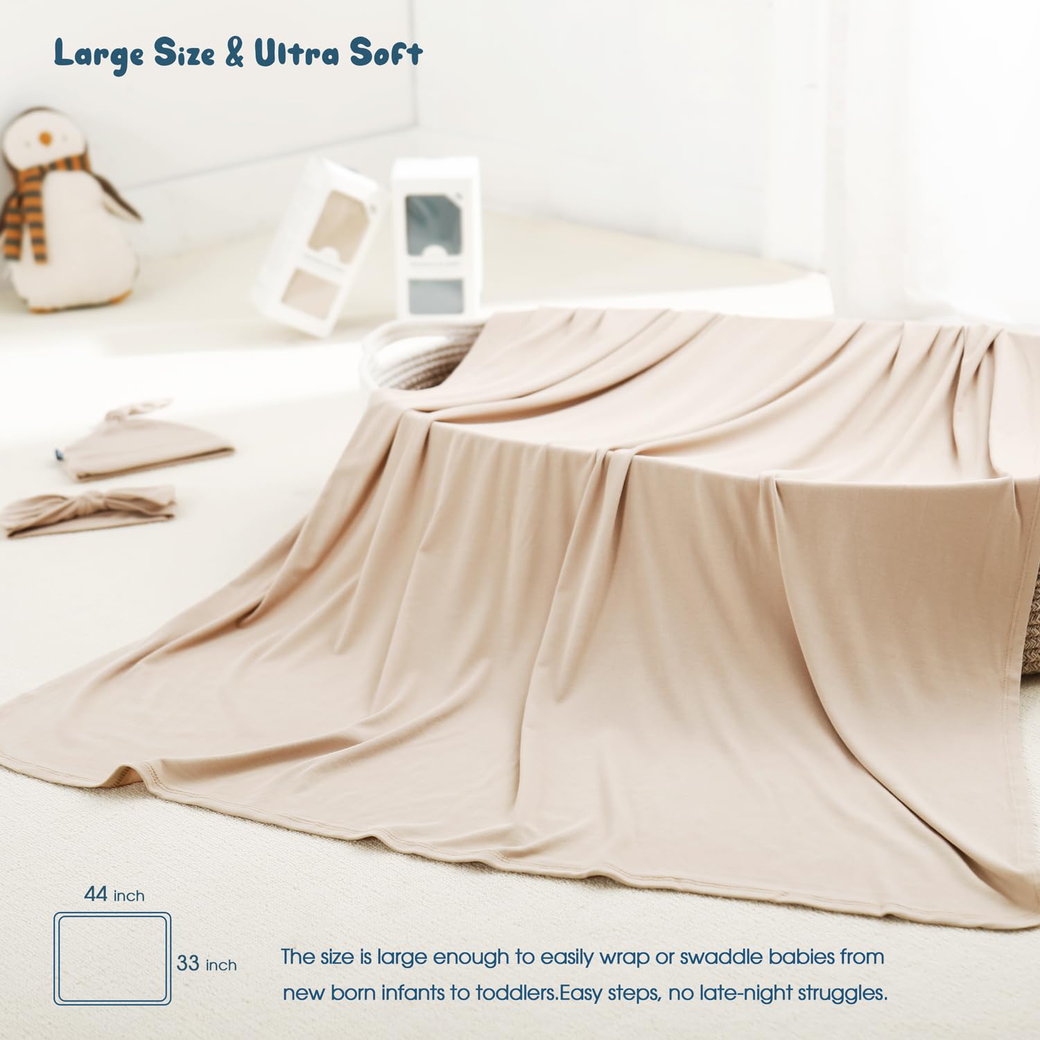 GRSSDER Newborn Swaddle Blanket, Ultra Soft Jersey Receiving Blanket with Matching Headband and Beanie Set 33×44", Stretchy Baby Neutral Swaddle Wrap for Girls and Boys