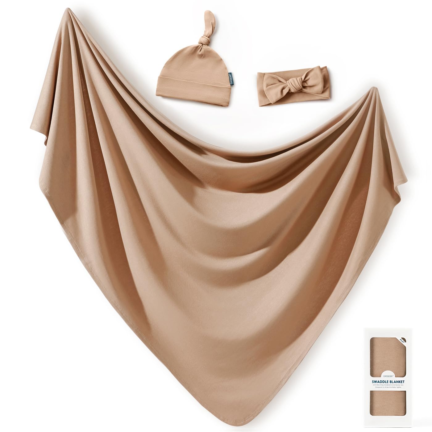GRSSDER Newborn Swaddle Blankets, Ultra Soft Jersey Receiving Blanket with Matching Headband and Beanie Set, Stretchy Baby Blanket 47×47", Neutral Swaddle Wrap for Girls and Boys