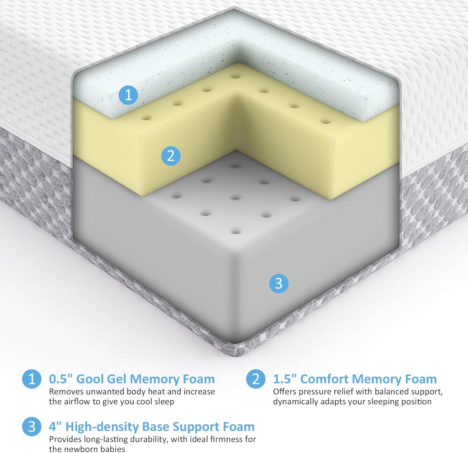 - ăBreathable & Comfortable Mattressă Integrated with Gel-infused memory foam, open-cell memory foam and high-density support core, the triple-layered mattress helps to regulate temperature by accelerating air circulation and transferring unwanted heat away from the body, giving your baby a cool and comfortable sleep environment, thus ensures a through-the-night sleep