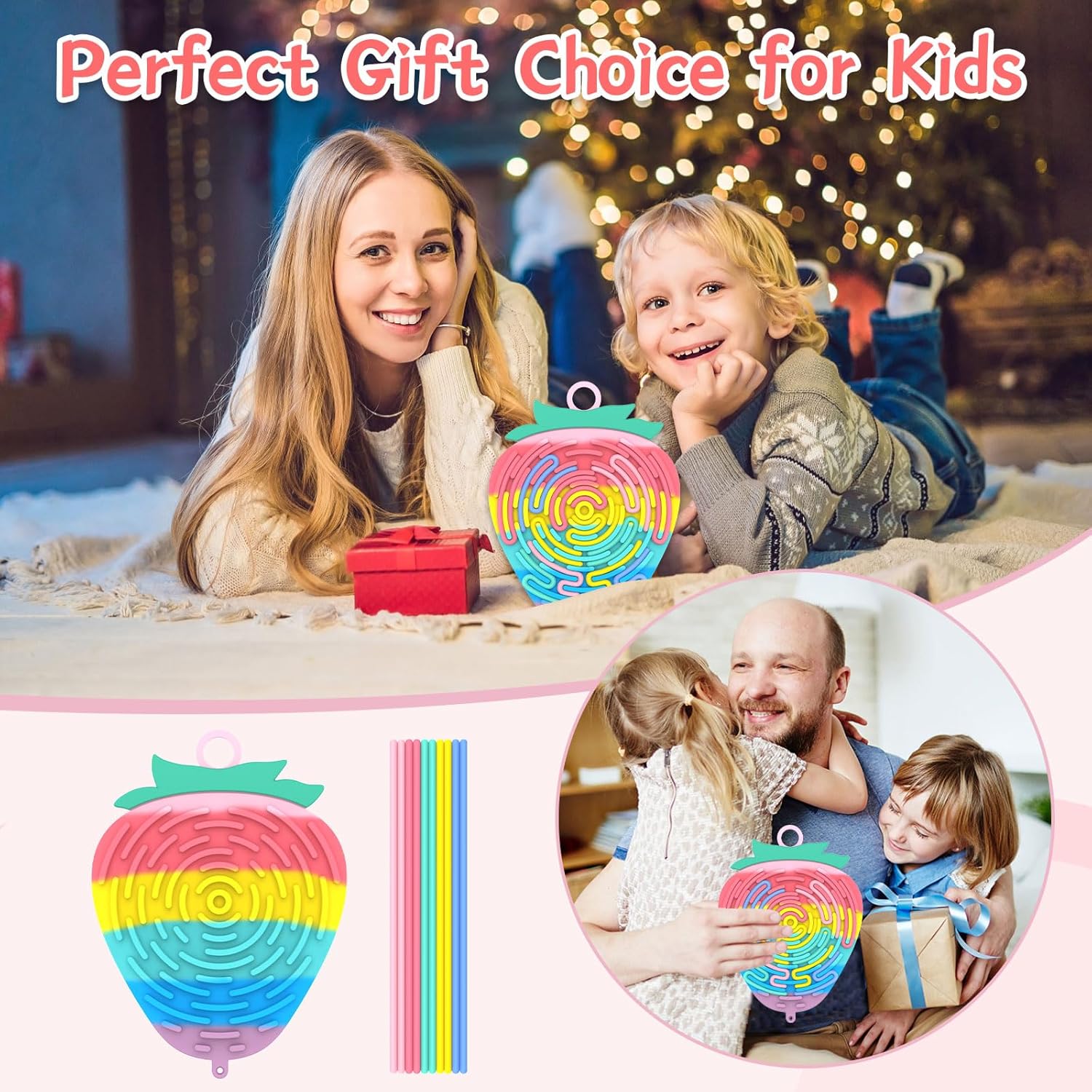 Silicone Sensory Activity Board,2 in 1 Busy Board for Fine Motor Skill, Montessori Fidget Toy for Calming, Stress, Anxiety, ADHD , Autism , Silent, No Mess , Kids 3+ & Adults (Colorful, Strawberry)