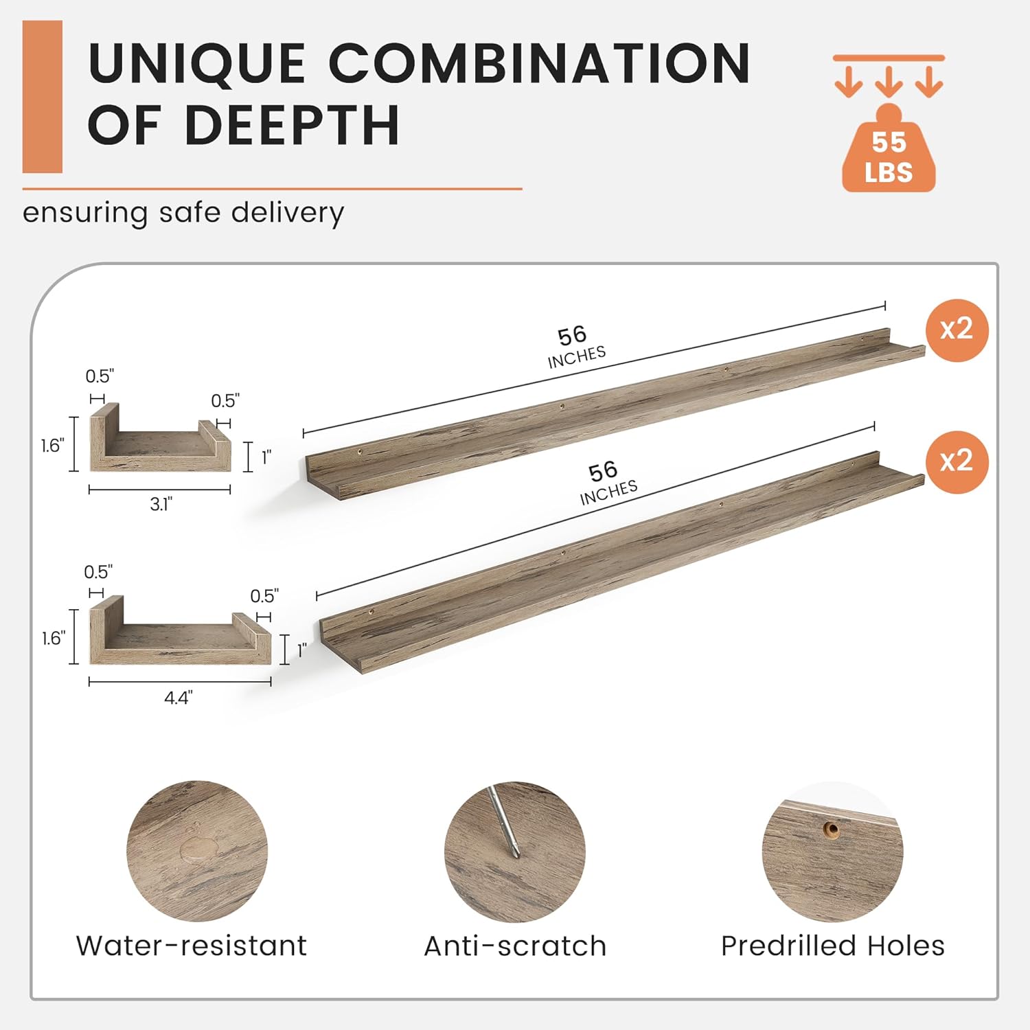 Floating Picture Ledge Shelves for Wall Set of 4, 56 Inch Wall Shelves with Lip Long Large Nursery Book Shelf for Toys Storage Kids Bookshelf Wall Mounted Living Room Bedroom Decor Frames