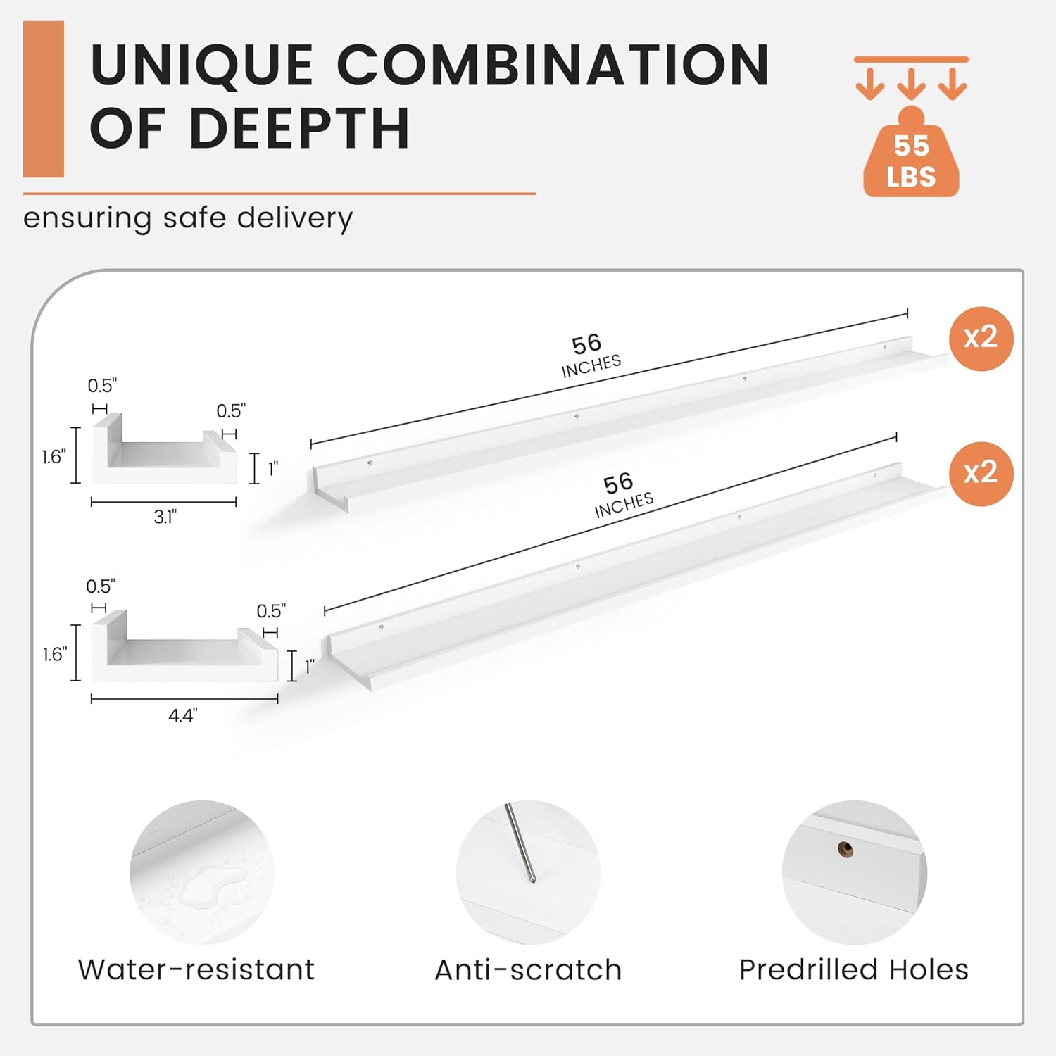 Floating Picture Ledge Shelves for Wall Set of 4, 56 Inch Wall Shelves with Lip Long Large Nursery Book Shelf for Toys Storage Kids Bookshelf Wall Mounted Living Room Bedroom Decor Frames