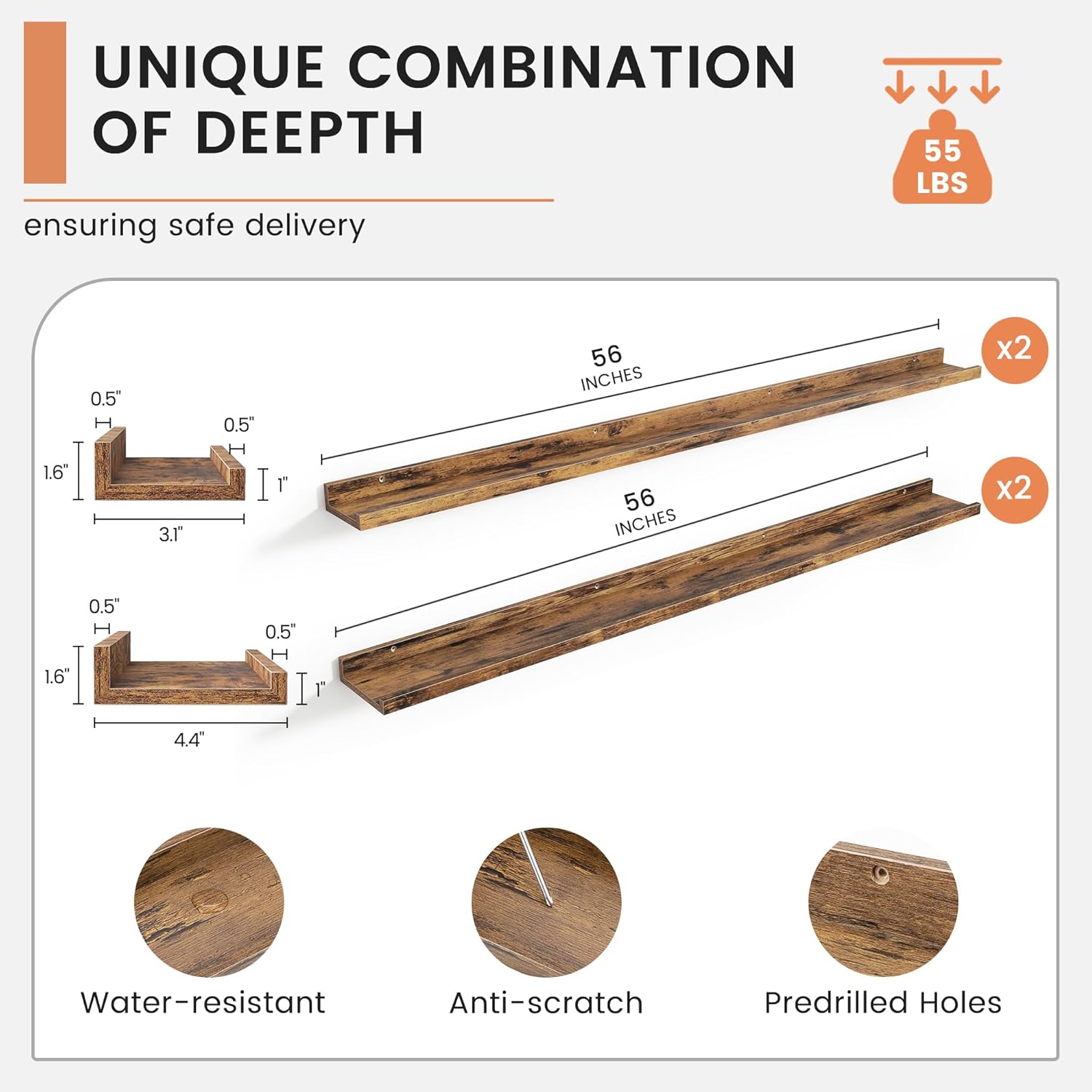 - ăBuilt to LastăEach floating wood shelves is made of high-quality wood, each shelf is designed for exceptional durability. The mounting holes are spaced 16 inches apart for secure wall stud installation, ensuring rock-solid support for your cherished items. Enjoy years of reliable use without sagging or warping