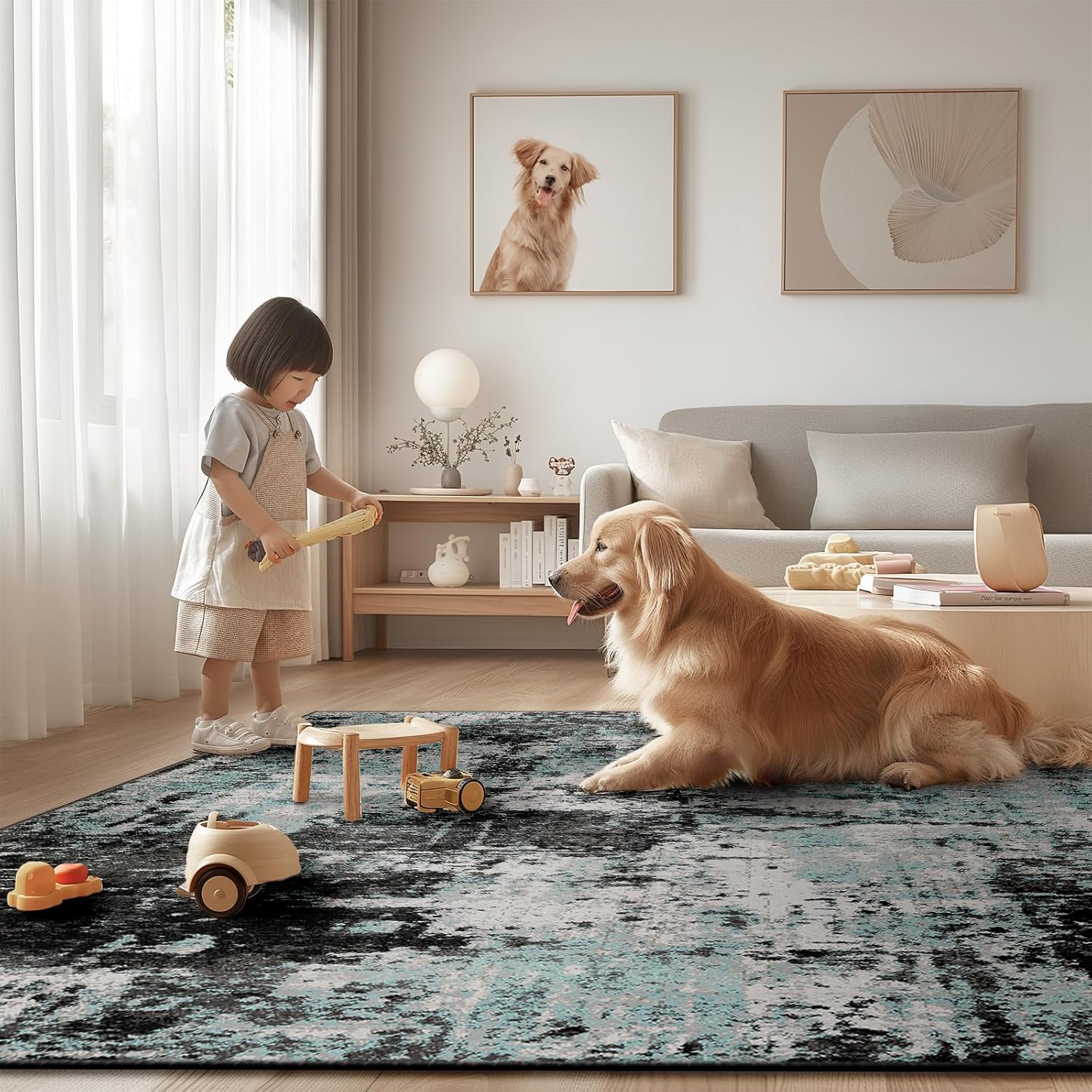 Washable Area Rugs 3'x5' Non-Slip Modern Abstract Soft for Living Room Entryway Bedroom Nursery, Print Pattern, Blue Black Teal