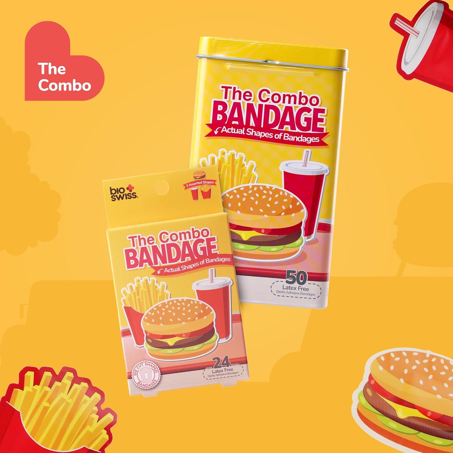 - COMBO MEAL BANDAGES: This 50 piece pack of adorable fast food shaped bandages is great for putting a smile on kids' faces while protecting wounds such as cuts, scrapes, and burns and comes in an assortment of french fries, burgers, and soda shapes; sticky bandages are perfect for kids and adults alike, and also for school nurses and pediatric doctors