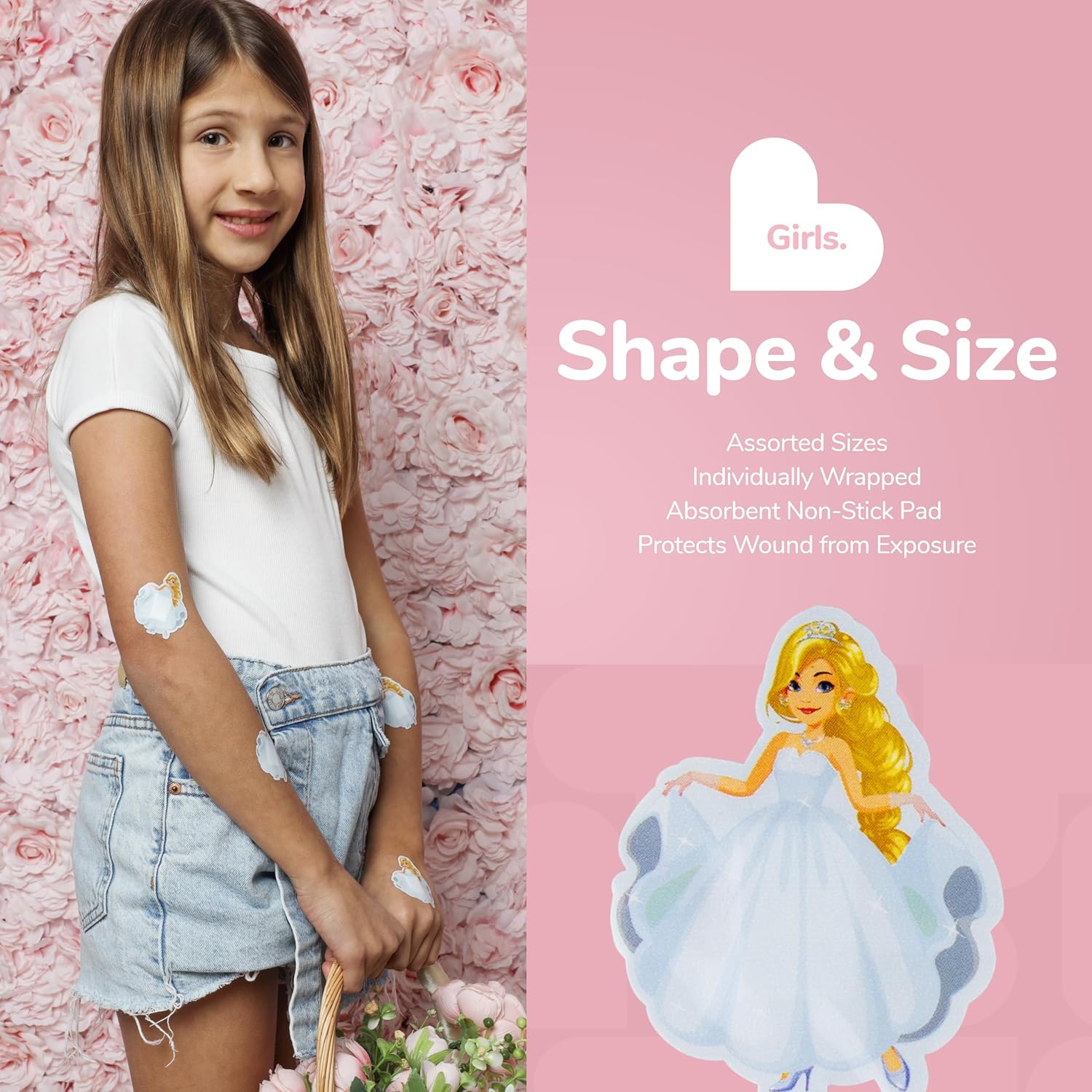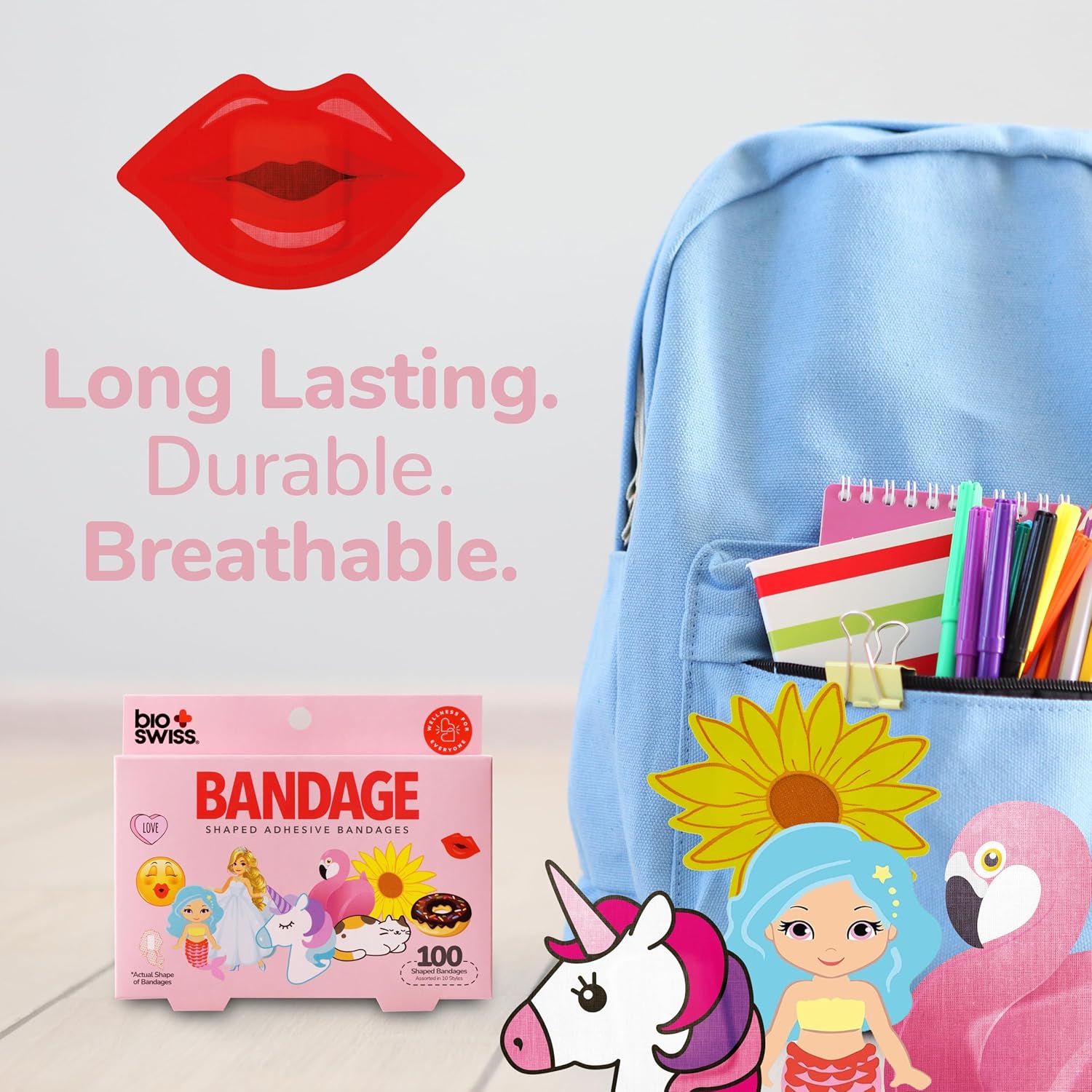 - ASSORTED BANDAGES: This 100 piece pack of adorable assorted girls bandages is great for putting a smile on kids' faces while protecting wounds such as cuts, scrapes, and burns, and come in 10 assorted styles (donut, kissy face, lips, cat, heart, flamingo, mermaid, cinderella, unicorn, and sunflower); sticky bandages are perfect for kids and adults alike, and also for school nurses and pediatric doctors