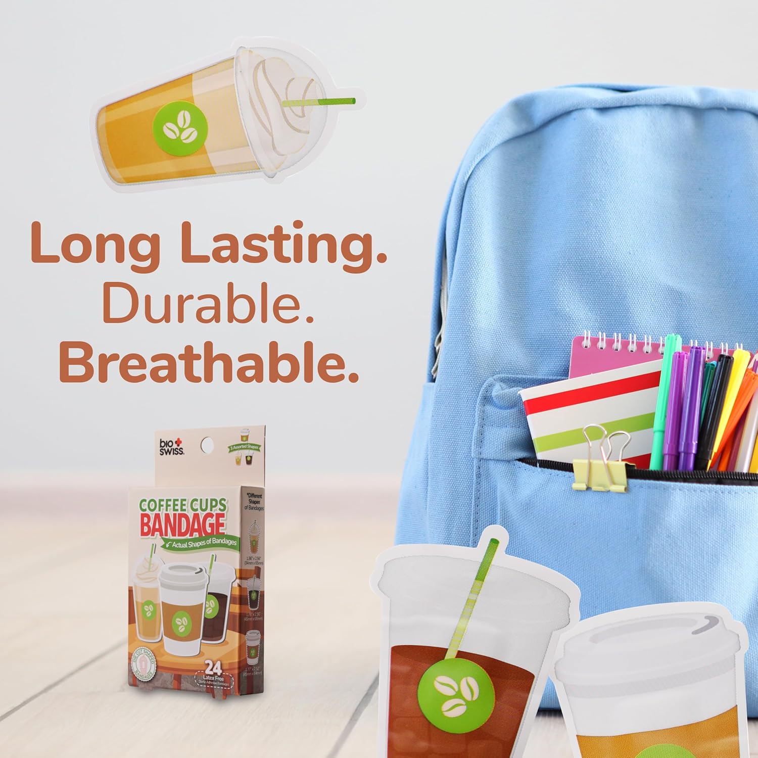 BioSwiss Bandages, Coffee Cup Shaped Self Adhesive Bandage, Latex Free Sterile Wound Care, Fun First Aid Kit Supplies for Kids, 24 Count