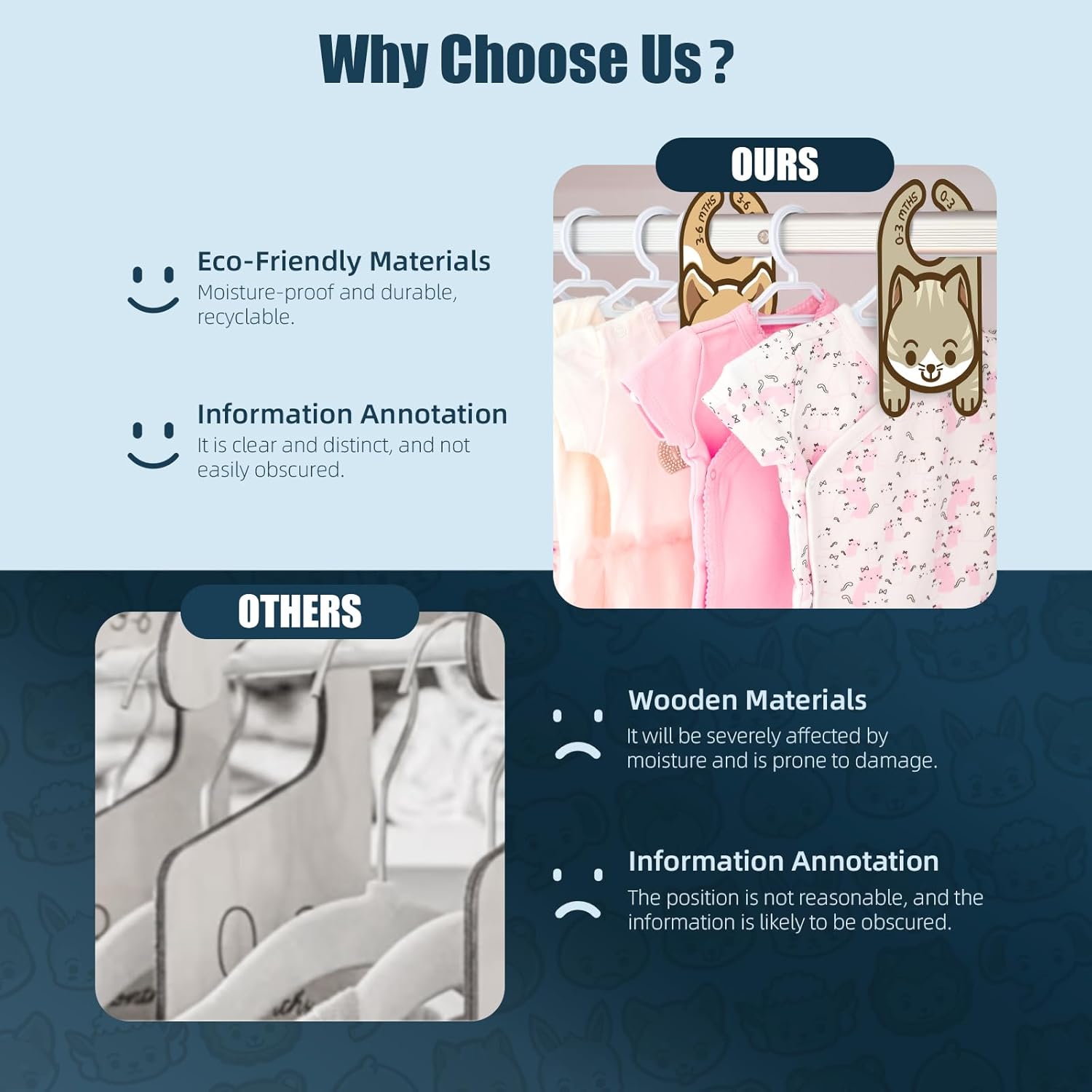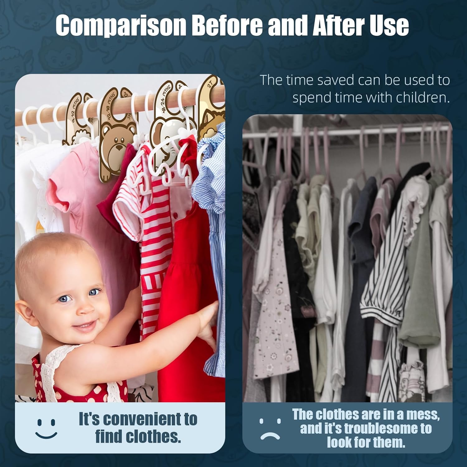 - 【Baby's Favorite Divider】These baby closet dividers is designed in bib shape, feature delightful colour, appealing to both parents and babies. The charming designs make baby hanger dividers easy to differentiate clothing sizes while adding a fun and playful touch to your baby's nursery. The engaging patterns of baby clothes hanger dividers not only assist in organization but also enhance the overall aesthetic, creating a cheerful and cute space for your little one.
