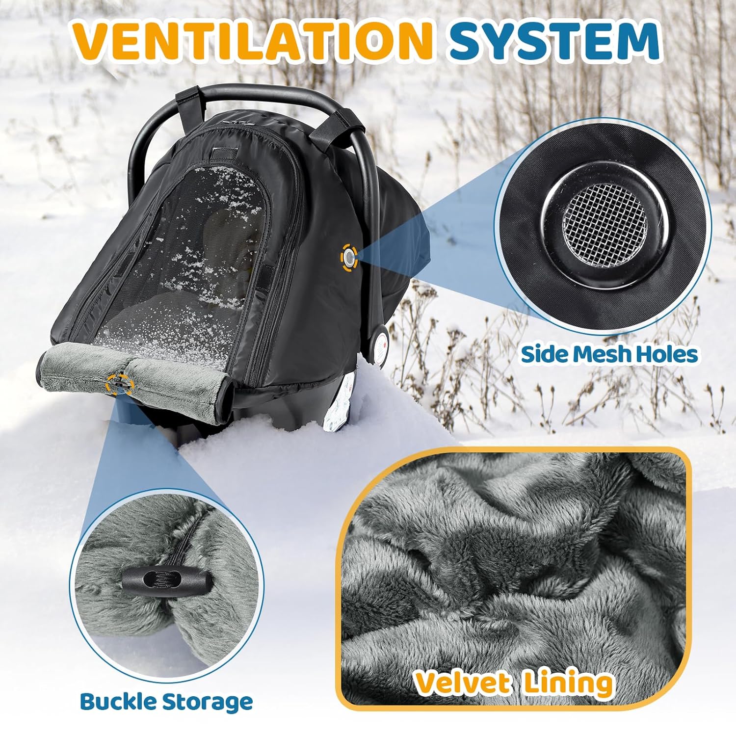 Orzbow Winter Car Seat Cover for Babies, Waterproof Carseat Canopy Cover with Peep Window of Breathable Mesh, Warm and Cozy Baby Car Seat & Carrier Covers for Cold Weather, Machine Washable, Black