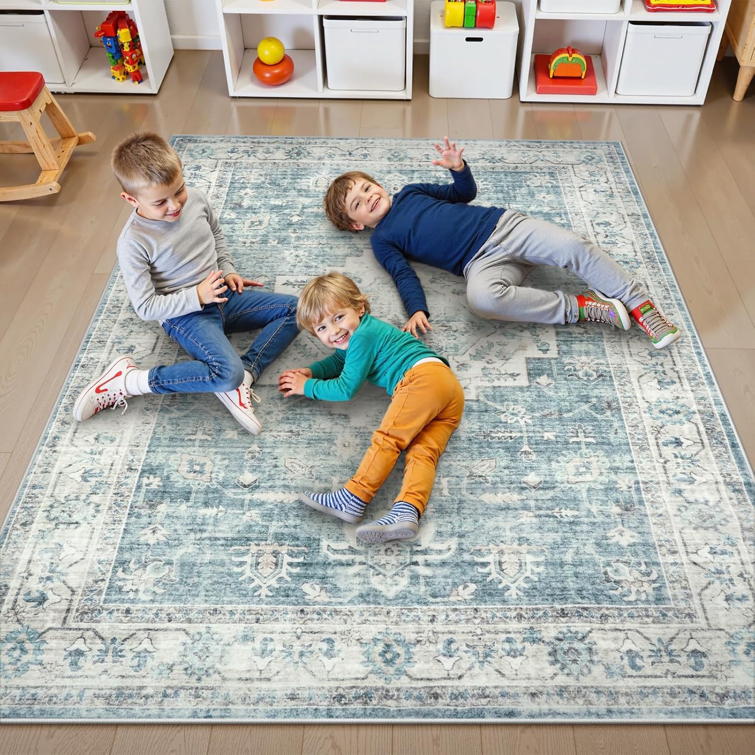 LIVEBOX Washable Area Rug 5x7 Rugs for Living Room Bedroom, Non-Slip Boho Indoor Carpet for Dining Room Office, Low-Pile Farmhouse Soft Carpets for Kids Nursery Room Playroom, Blue