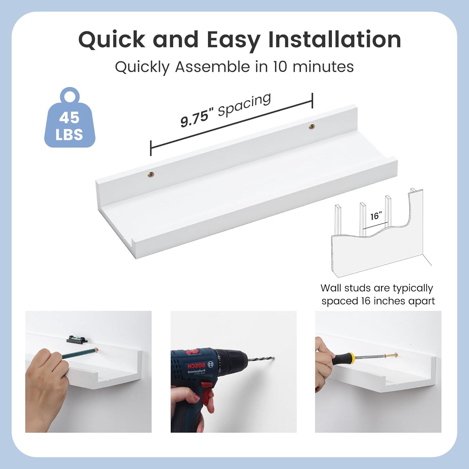 - Easy to Install: You will get a level, screws for the wall, drywall anchors, a detailed installation guide, and two beautiful hand-crafted solid pine wood shelves. With the level, you can make sure your picture ledge shelves are well aligned. Just follow the simple instruction to install the hanging shelves for wall decor within 10 minutes. We add additional screw and anchor to the hardware bag just in case. If you have any questions about our products, please feel free to contact us