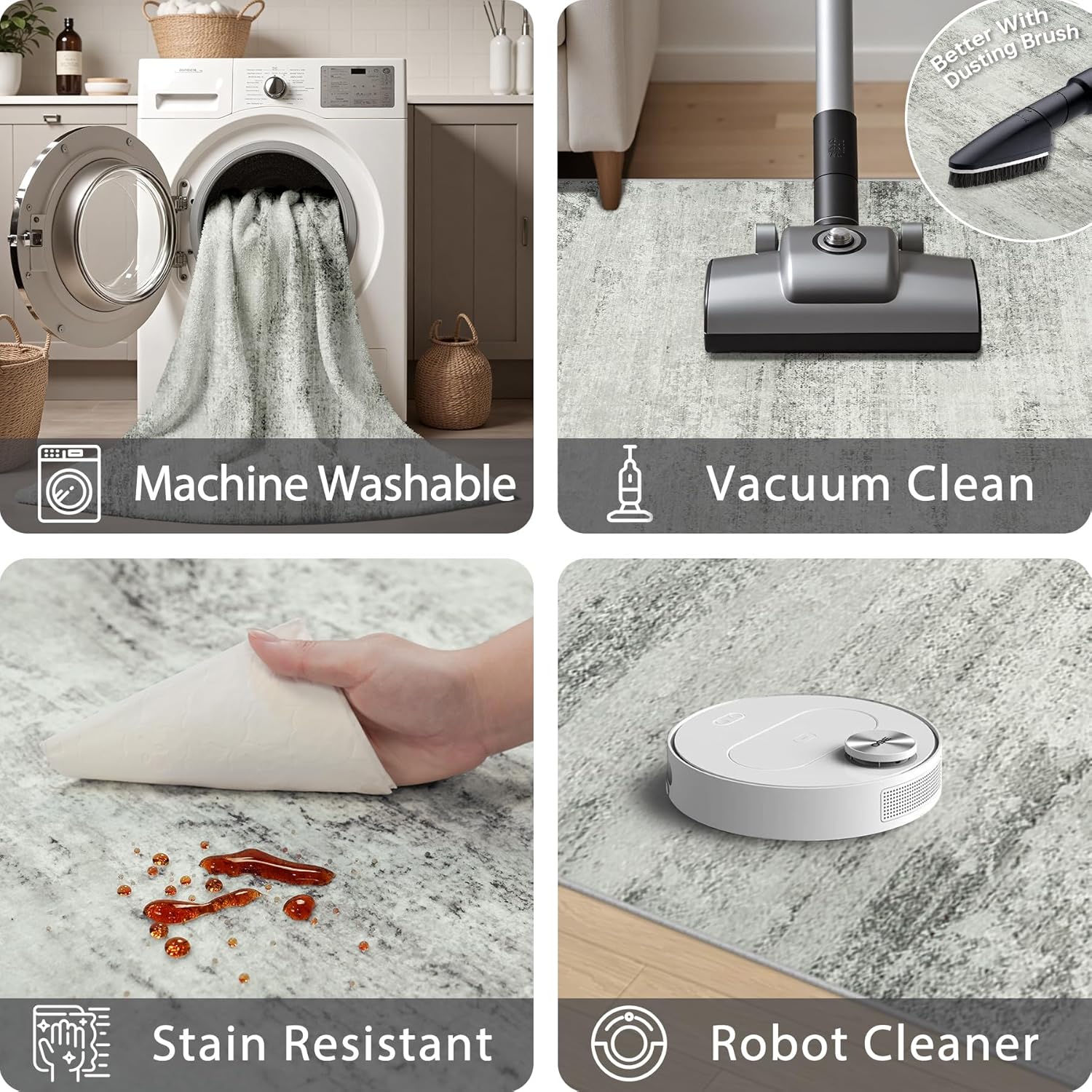 Area Rug 9x12 Washable Rugs: Abstract Large Living Room Rugs with Non-Slip Backing, Thin Carpet for Dining Room Table Bedroom Nursery Indoor Home Office-Gray