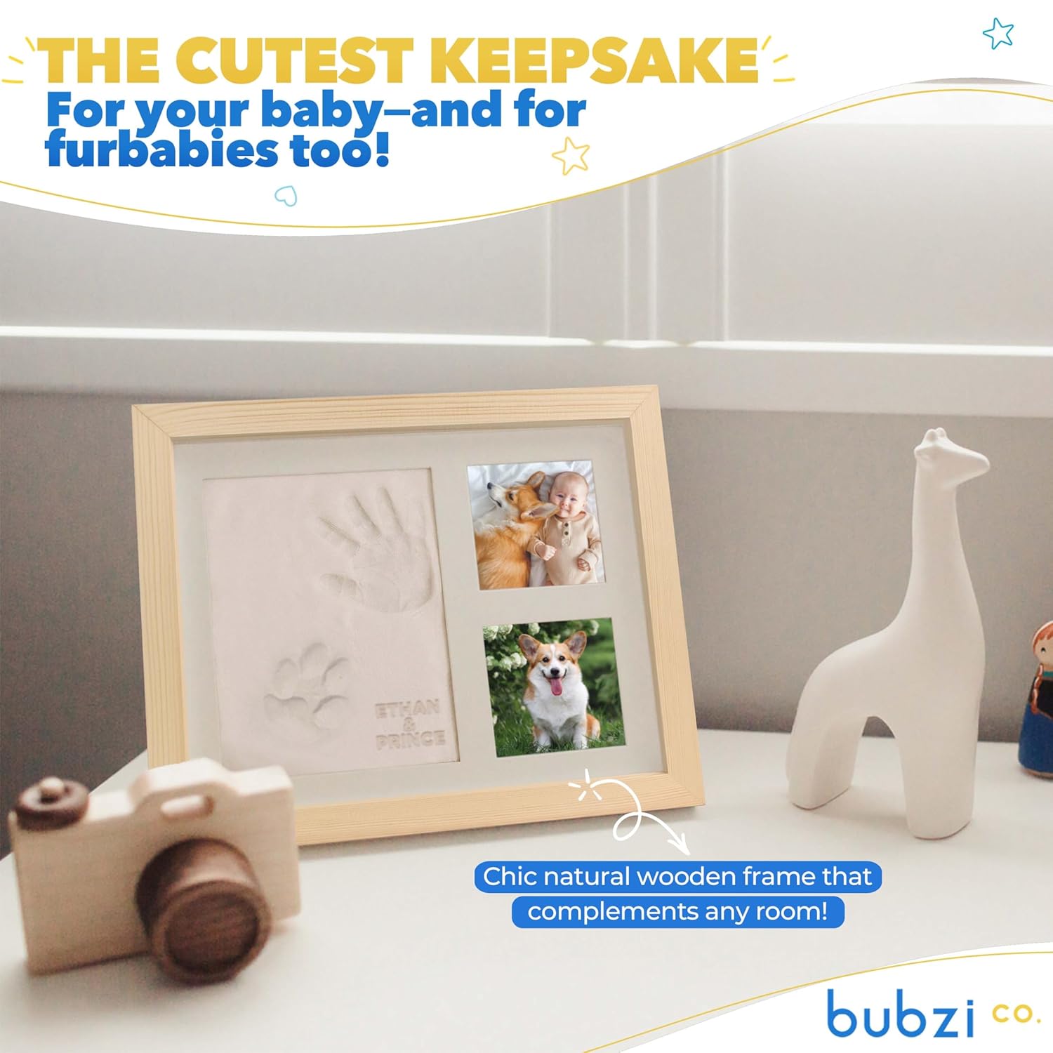 - EASY TO USE FOR BABY AND PETS The Bubzi co baby keepsake frame is designed with you in mind. Even with the tiniest, wiggliest, fingers and toes, you can flawlessly capture your newborn's handprint, footprint ( or even paw print ). Simply press their tiny hand or foot into the soft, air-drying clay to capture a precious imprint you will cherish forever!