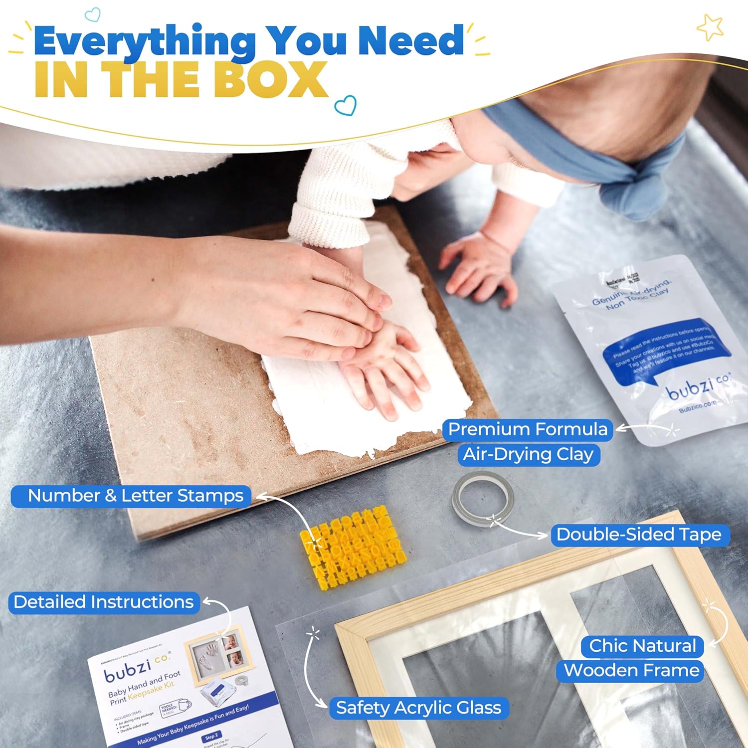 - COMPLETE MEMORY MAKING SET This baby hand and footprint kit includes everything you need! Air-drying clay, a wooden frame, acrylic safety glass, double-sided tape, letter stamps, and detailed instructions. It's the perfect present for a new mom or a cute and meaningful addition to your baby boy or baby girls nursery decor!