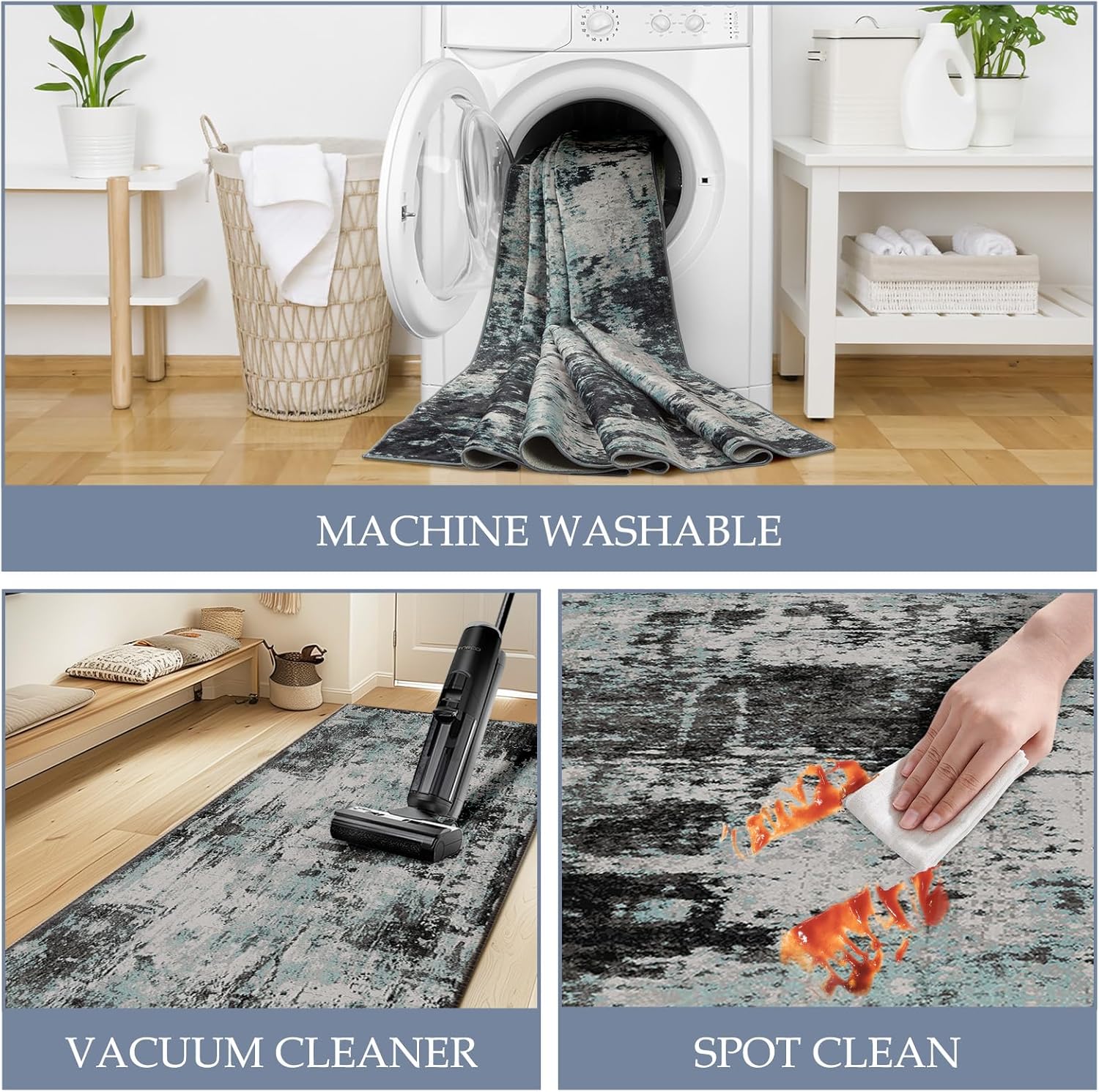 - Tides Series – Effortless style that flows with your life.This modern machine-washable non-slip rug features reinforced edges and a low-pile design that resists dirt. Its water-repellent surface makes spills easy to clean - liquids bead up for quick wiping. Simply machine wash in cold water (no bleach) to refresh. The non-slip backing keeps it securely in place. A perfect blend of function and contemporary design for active homes.