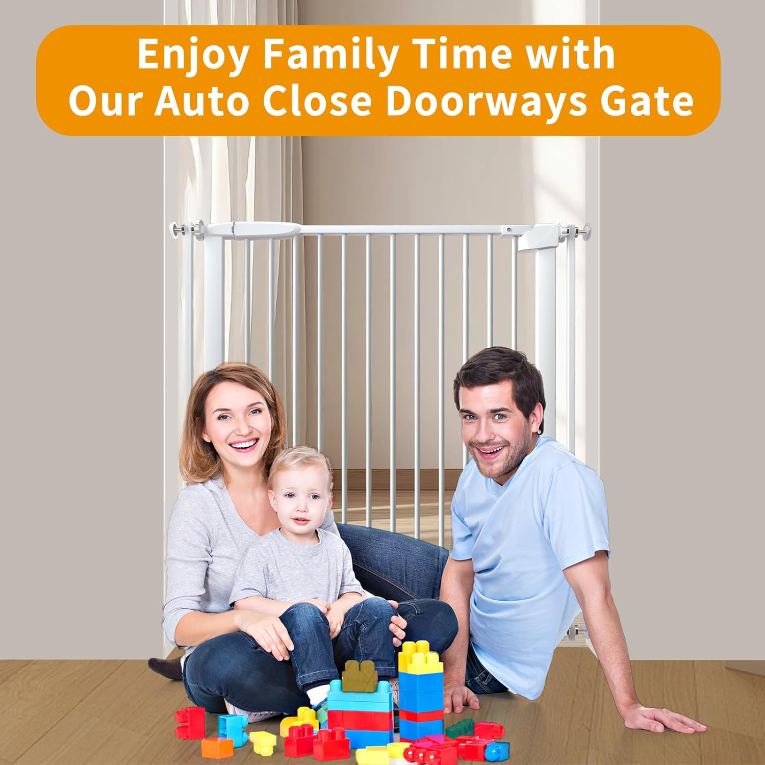 - Auto-Close Feature :Our baby gate offers a wide door for easy access,180° Full Door oscillate,baby gate Auto-Close Below 90°,dog gate Keep Opening in 90°.You can easily hold your baby in one hand and open the baby gate with the another hand.