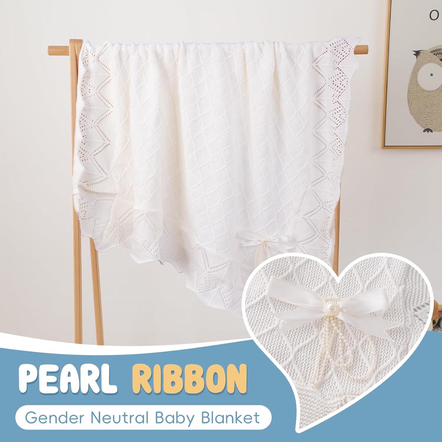 - 【Exquisite Designs】This baby blankets newborn is designed with a cellular construction and reticulate knitting craftwork can bring your extraordinary hand feel and advanced texture .Our receiving blankets neutral with pearl ribbon decoration. Our baby boy girl blanket not only can keep the baby comfortable and cozy, but also this exquisite appearance is very suitable for christening gifts.