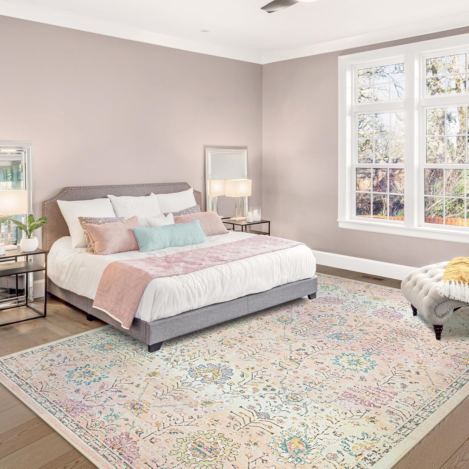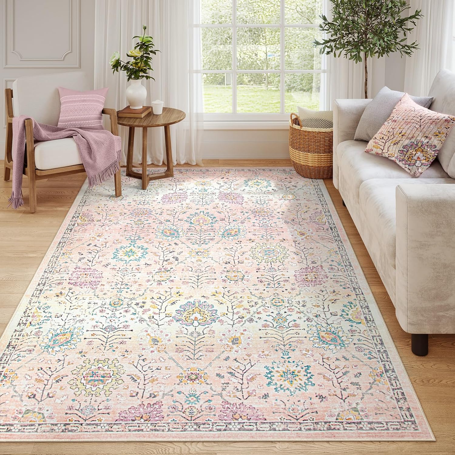 Lahome Light Pink Boho Rug, 6x9 Washable Rugs for Bedroom Girls, Soft Floral Kids Carpet with Non-Slip Backing for Nursery Playroom Kids Room