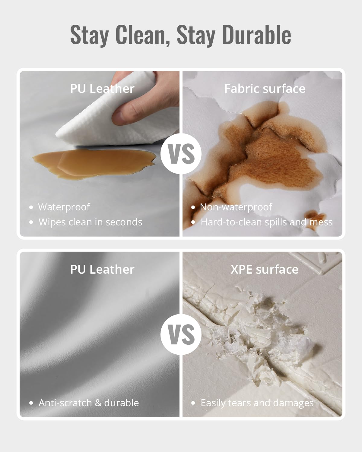 - Durable Vegan Leather for Long-Lasting Use: Our baby play mat surface is crafted from high-quality Vegan leather, offering superior durability compared to traditional XPE mats. The premium surface is designed to resist wear and tear from everyday use, maintaining its stylish appearance. This mat provides a reliable play area that stands the test of time