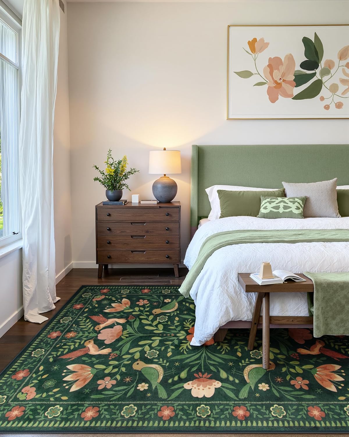 Moynesa Boho Bird 9x12 Area Rug Washable Living Room Rug, Low-Pile Green Floral Bedroom Rugs for Living Room Stain Resistance, Vintage Soft Large Rug for Kids Playroom Nursery