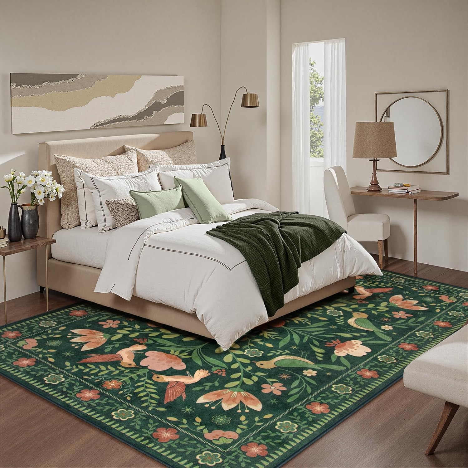 Moynesa Boho Bird 5x7 Area Rugs for Living Room, Washable Green Rug Jungle Floral Bedroom Rug, Low-Pile Soft Vintage Floor Carpet Non-Slip for Dining Room Playrom Living Room