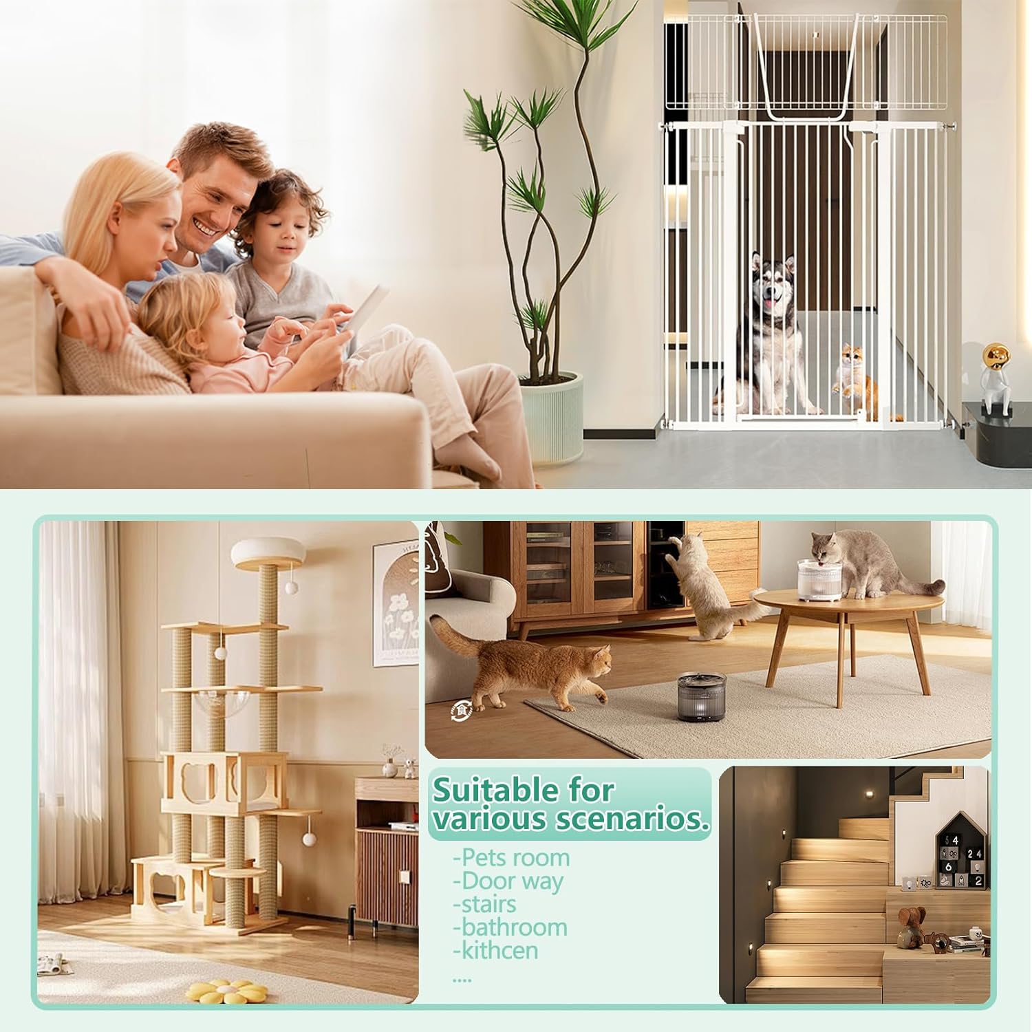 - Adjustable & Versatile for Various Spaces:Perfect for hallways, staircases, and kitchen spaces, our adjustable cat gate fits doorways ranging from 28.5" to 48.7" in width. It includes both 5.5" (14 cm) and 8.26" (21 cm) extensions, making it an ideal fit for various spaces. (Note: Please measure your doorway width before purchasing to ensure a perfect fit).