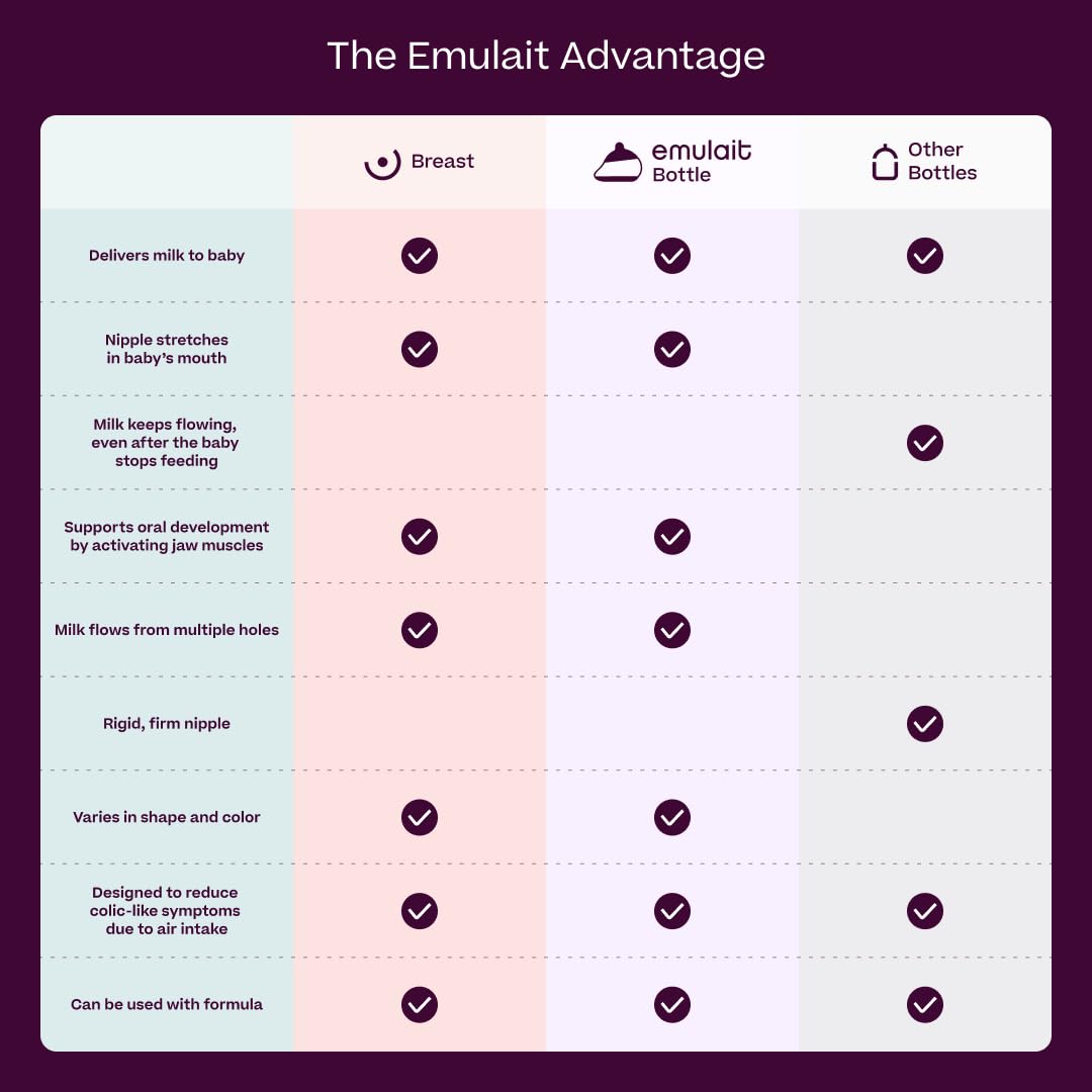 - Revolutionary Nipple Innovation: Emulait nipples replicate the softness, texture, and elasticity of a real nipple, fostering natural suckling actions and oral development. Uniquely stretchable so that baby needs to work as they would when nursing, for a feeding journey that supports easier transitions between bottle and breast.