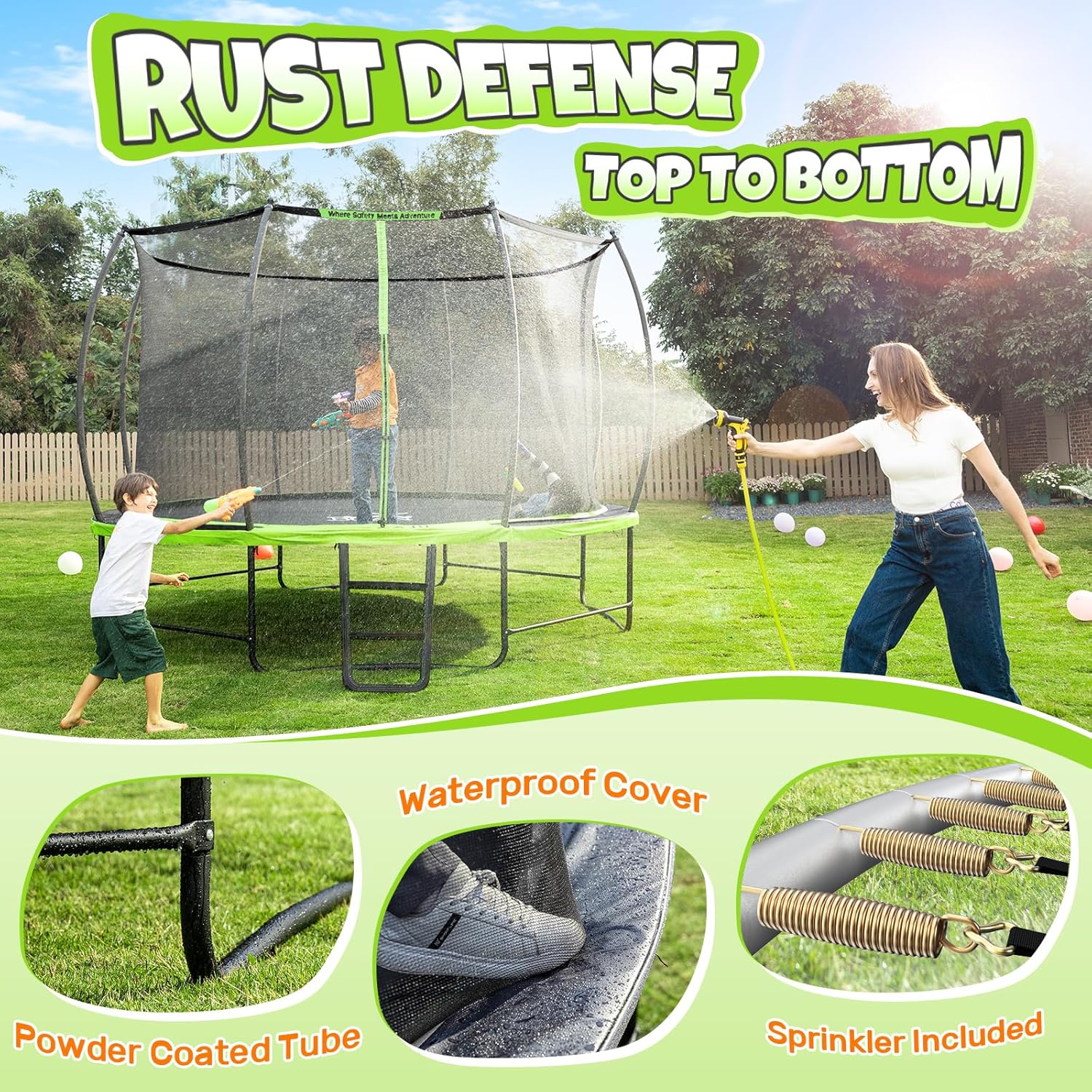 - Playground for years to come - Endless fun - Our trampoline is designed to look as good as new in a long time, with twice GALVANIZED sturdy frame and springs, expertly black POWDER-COATED legs, offering superior RUST PROTECTION in rough weather. Your children can make lasting memories, just jump and the fun never ends.