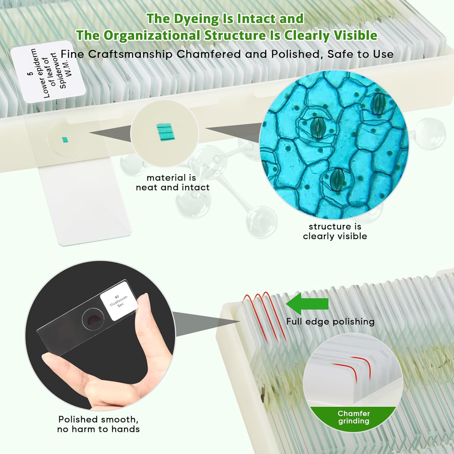 - Glass Microscope Slide Preparation Kit is Clean and Smooth. The Material Is Intact, The Staining Is Even, Clear and Coordinated, and The Parts and Tissue Structures Are Clearly Visible. Kids Microscope Slides for Kids 8-12 Has Been Carefully Chamfered and Polished, and The Fine Workmanship Has Been Upgraded. Each Edge of Glass Slides for Microscope Is Polished and Frosted, Not Sharp, which Can Prevent Cuts on Your Hands and Is Safe to Use