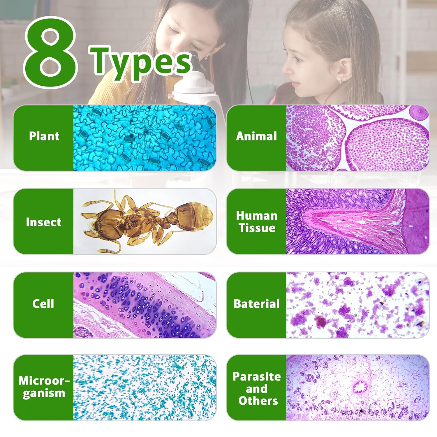 - A Great Set of Prepared Microscope Slides for Kids 8-12, Protected by Double-layer Bubble Film, to Protect Against Shock, Drop, and Breakage. Prepared Slides for Kids Microscope Contain A Variety of Interesting Specimens, Suitable for Children, Adults, Teenagers, Young Scientists, Students, Teachers, Beginners Practicing Microscopes, Amateurs, as Microscope Accessories to Adapt to Various Types of Microscopes to Explore The Wonders of The Microscopic World