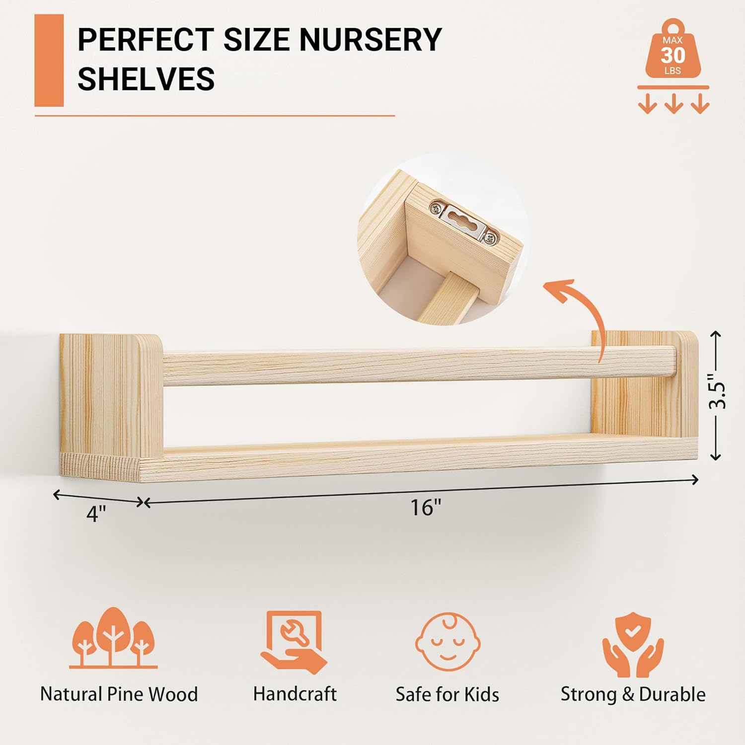 - [Experience Effortless Mounting] - Our nursery floating shelf comes with detailed step-by-step instructions and a complete hardware kit for easy installation. Measured size of 4” D x 16.5” W x 3.5” H, ideal size for nursery room.