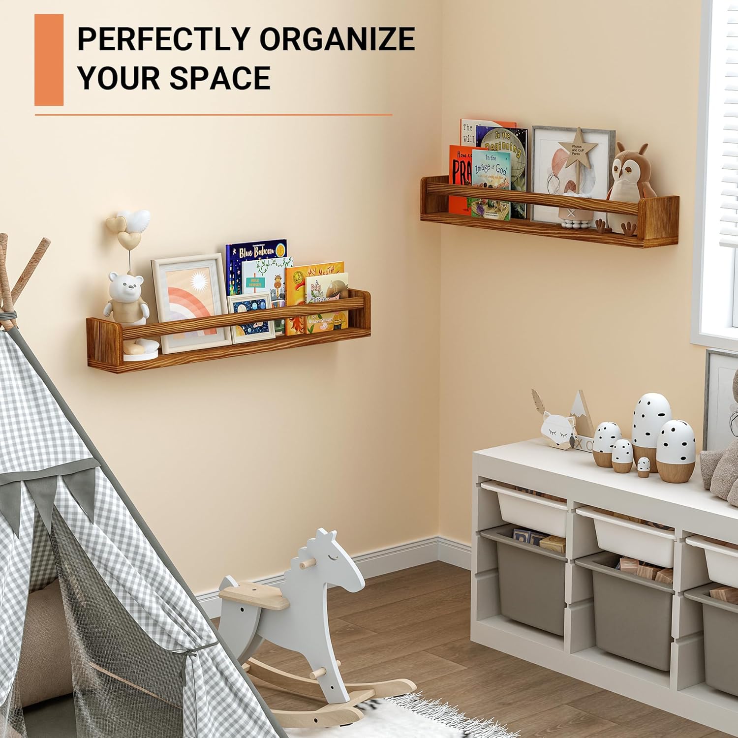 - [Ample Storage Space] - Measuring 24 inches, these nursery shelves offer ample room for organizing children's books, toys, photos, and other small items. They encourage a love for reading while keeping spaces tidy. With 0.6” thicken panels, each bookshelf can hold up to 30 LBS