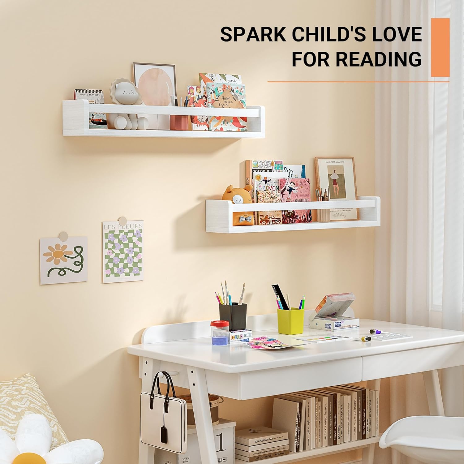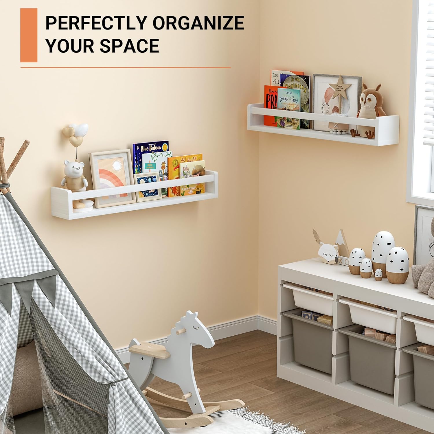 - [Ample Storage Space] - Measuring 24 inches, these nursery shelves offer ample room for organizing children's books, toys, photos, and other small items. They encourage a love for reading while keeping spaces tidy. With 0.6” thicken panels, each bookshelf can hold up to 30 LBS