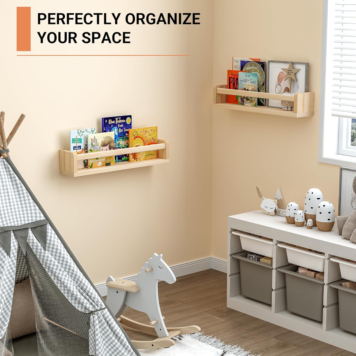 - [Ample Storage Space] - Measuring 16.5 inches, these nursery shelves offer ample room for organizing children's books, toys, photos, and other small items. They encourage a love for reading while keeping spaces tidy. With 0.6” thicken panels, each bookshelf can hold up to 30 LBS