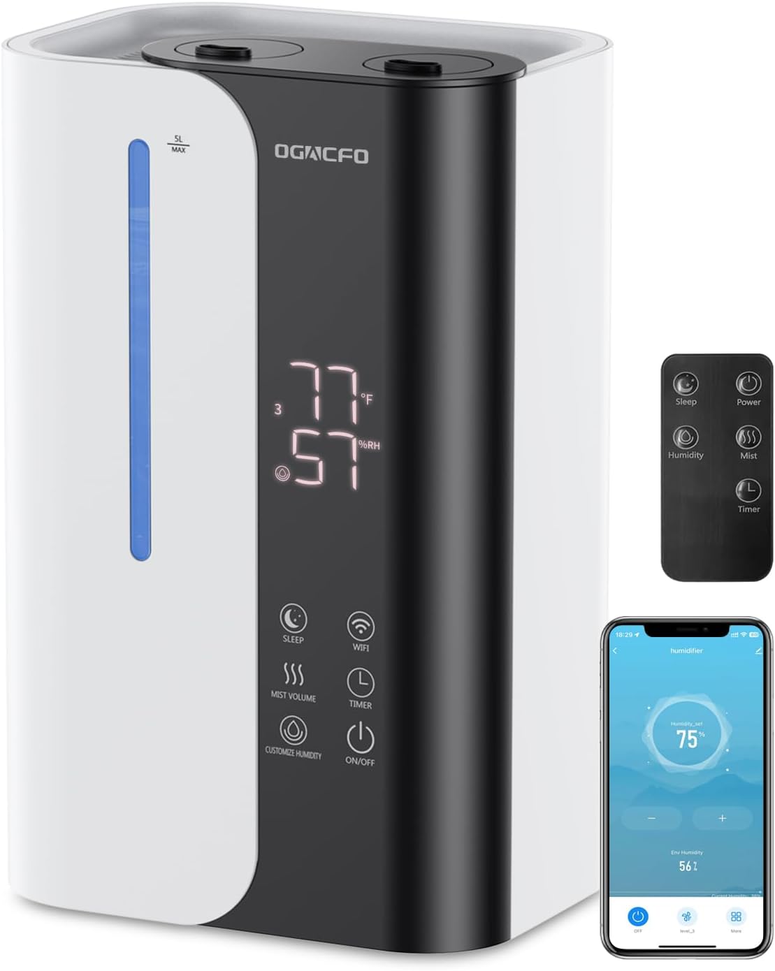 - ๐๐ฆ๐๐ซ๐ญ ๐๐จ๐ง๐ญ๐ซ๐จ๐ฅ ๐ฐ๐ข๐ญ๐ก ๐๐ฎ๐ฒ๐ ๐๐ฉ๐ฉ: Connect this large humidifiers for home to Wi-Fi and control it remotely through the Tuya app. Turn it on/off, adjust humidity levels, modify mist output, set a 24-hour countdown, and more, all from your phone