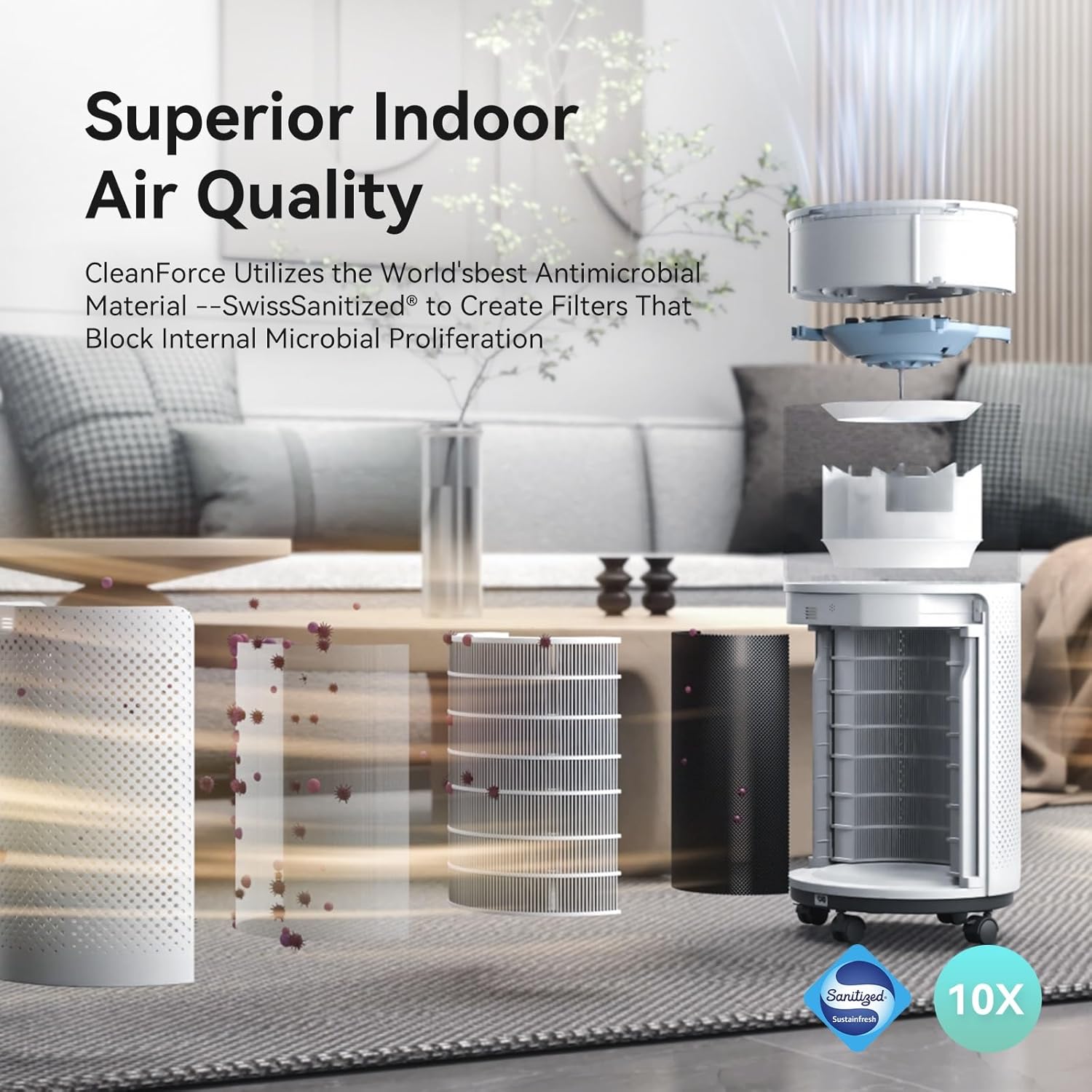 - Pet-Friendly: Designed for pet households, CleanForce air purifier removes 99.99% of allergens, pet dander, and odors, exceeding H14 HEPA standards. It effectively filters pet hair, dust, pollen, mold spores, viruses, bacteria, and VOCs, a cleaner environment for you and your furry friends. Enjoy reliable protection for a healthier home