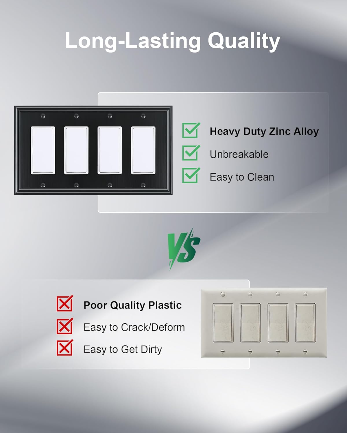 - Durable Solid Zinc Alloy - Constructed from thick and sturdy zinc alloy, the 4 gang switch plate offers exceptional durability and sturdiness, easier to clean and maintain. It is resistant to high impact, tarnishing, and corrosion, unbreakable. Ensuring it remains a stunning and long-lasting addition to your home.