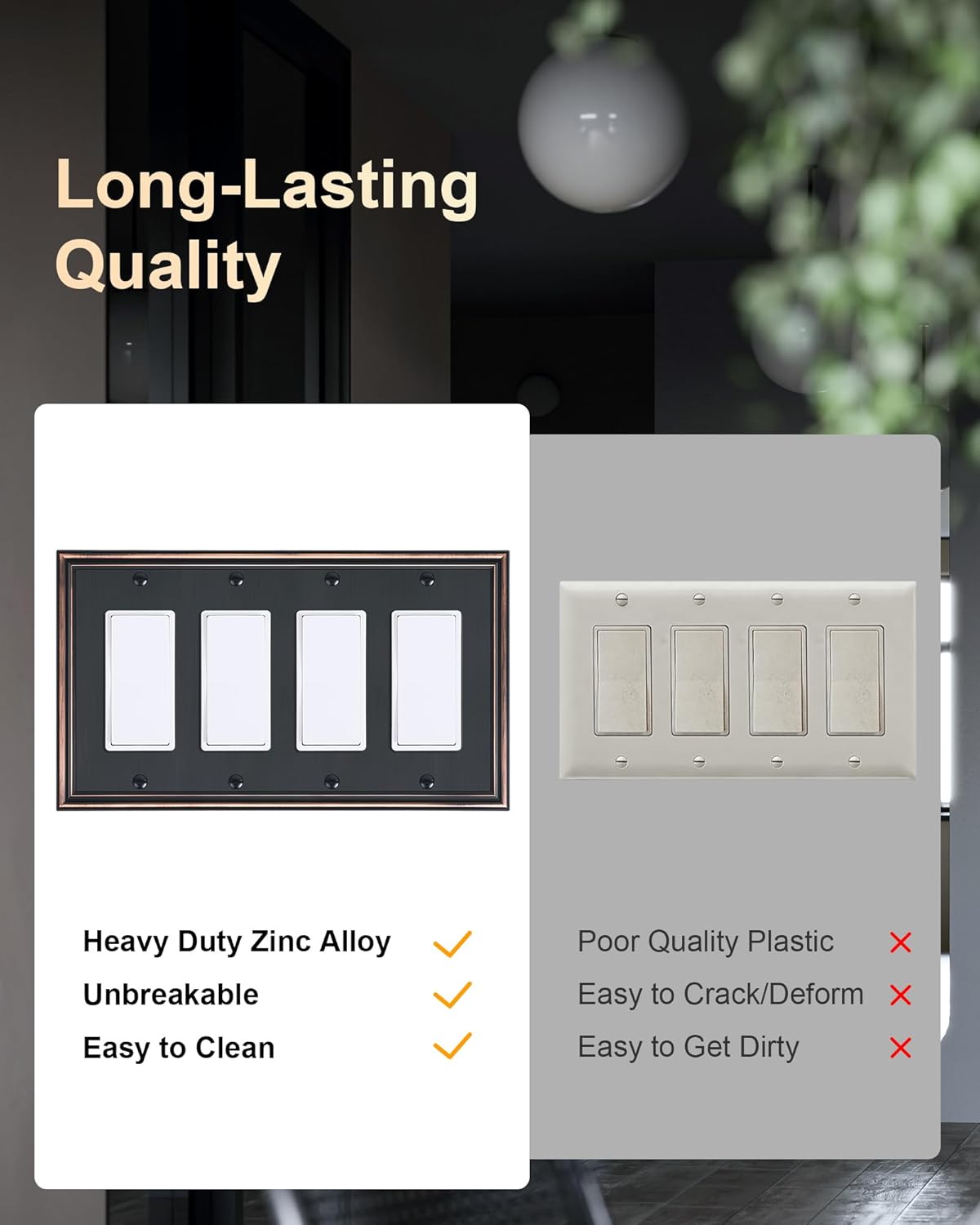 - Stylish yet Simple - Beautifully designed with simple, clean lines and exquisite aged bronze finish, our 4 gang switch plate adds a touch of elegance and sophistication to your decor. The brushed texture further enhances its stylish appeal, effortlessly complements any room, adding an instant touch of elegance and charm.