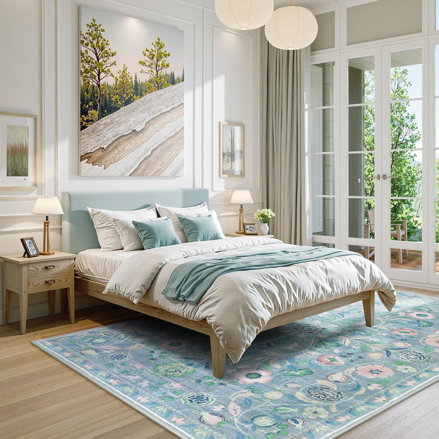 Anidaroel Blue Floral Rugs for Living Room 8x10, Washable Boho Area Rugs for Bedroom Vintage Soft Nursery Rug, Non-Slip Stain Resistant Dining Room Mat Carpet for Kids Playroom Office