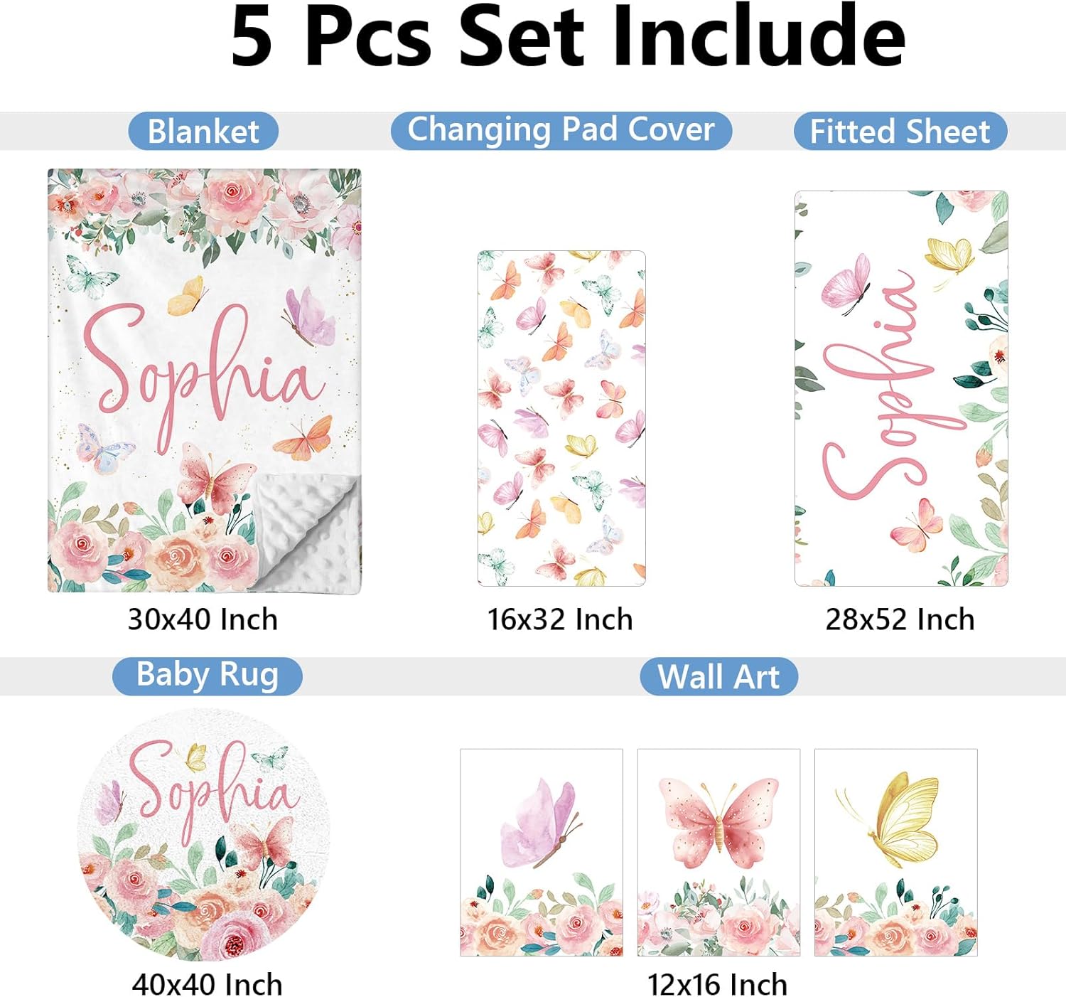 Personalized Baby Crib Bedding Set, 5 Pcs Custom Baby Crib Sets with Name, Double Layer Butterfly Nursery Bedding Set for Girls, Soft Flannel Baby Bedding Set, Toddler Infant Customized Gift